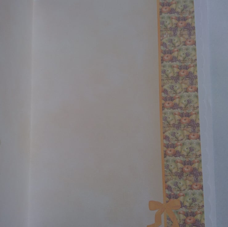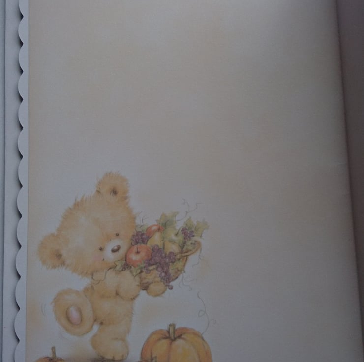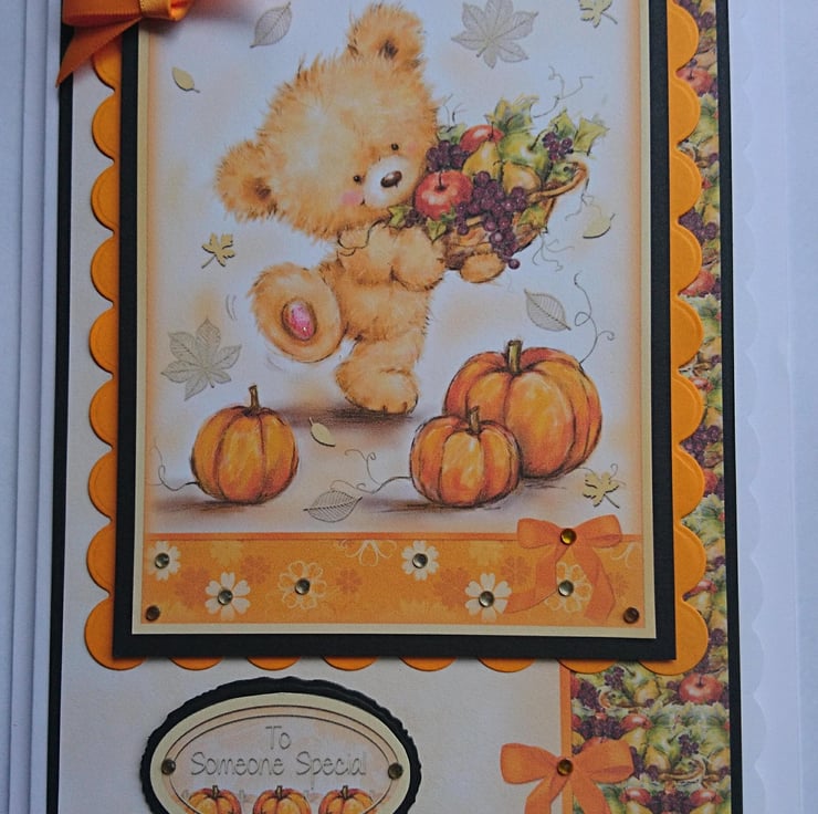 The design is a very cute teddy bear holding a basket full of harvest fruits - apples, pears, grapes etc, surrounded by falling Autumn leaves and plump pumpkins. The 3D greeting says "To Someone Special". Everything has been hand-cut by me and the card has been finished with gems and a matching orange satin ribbon bow.