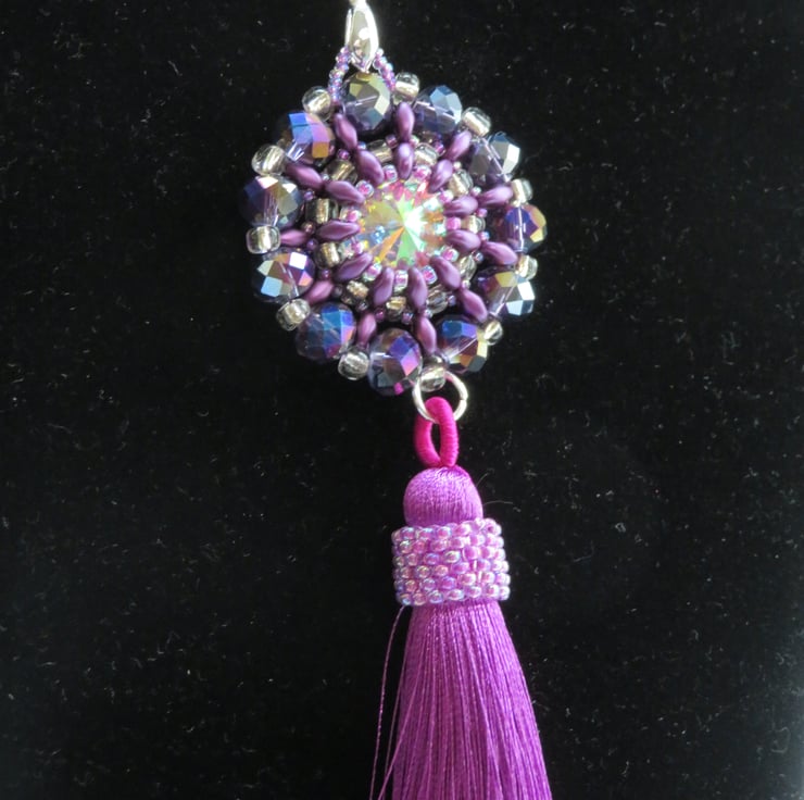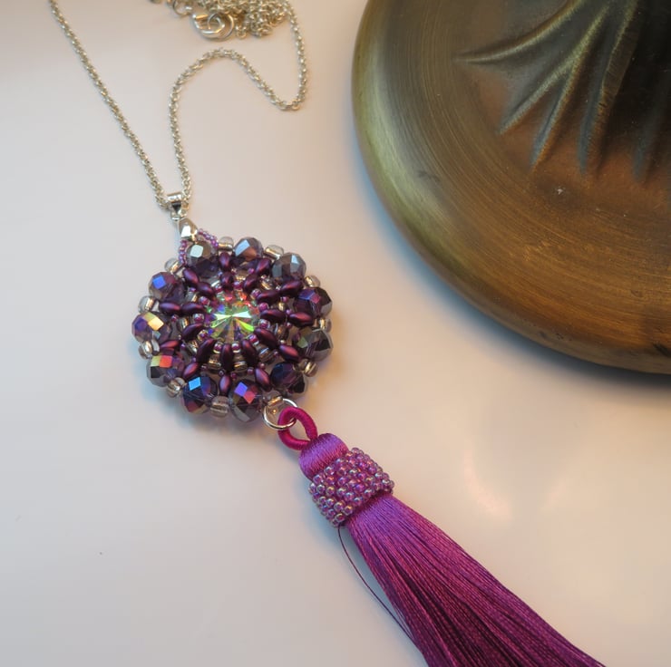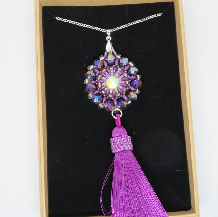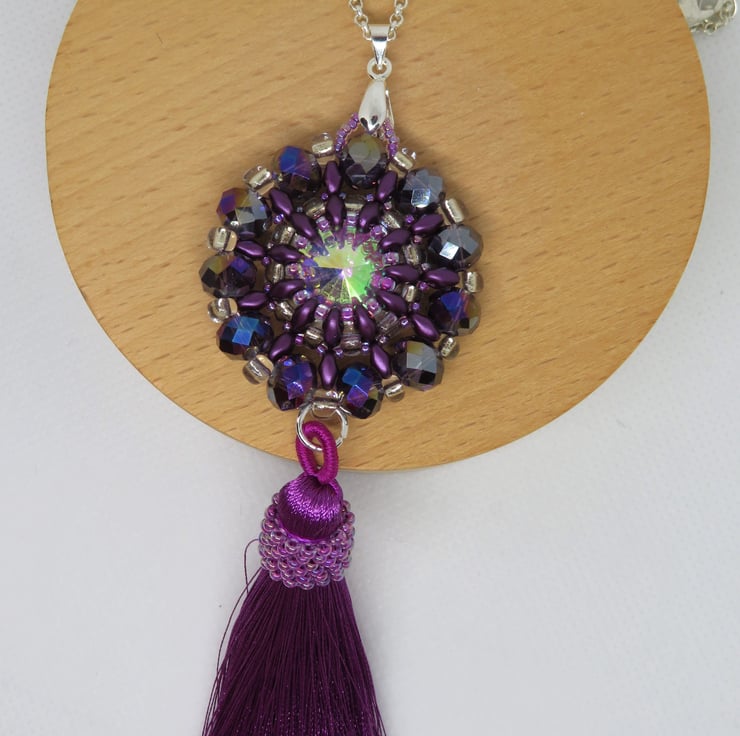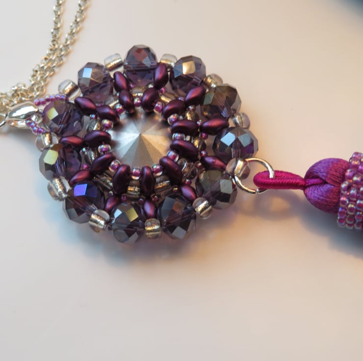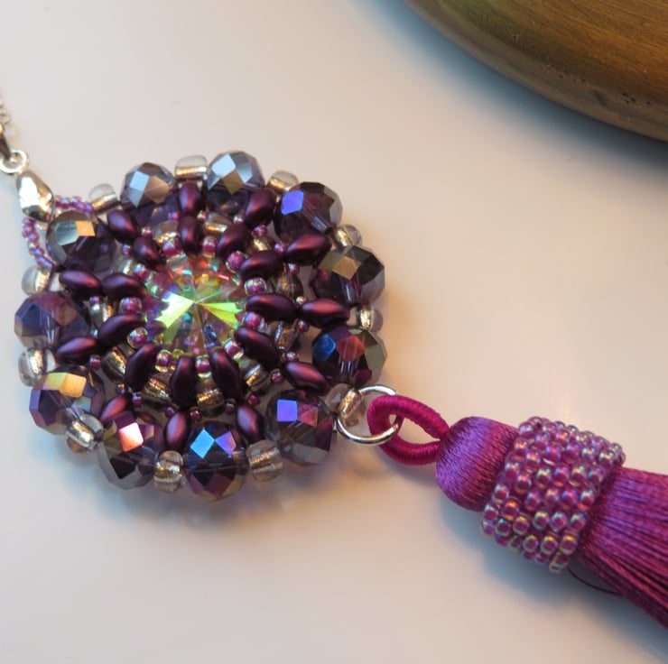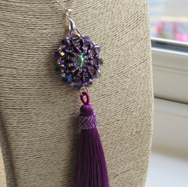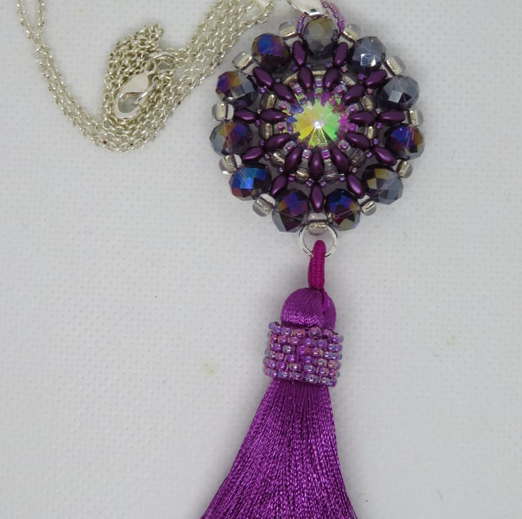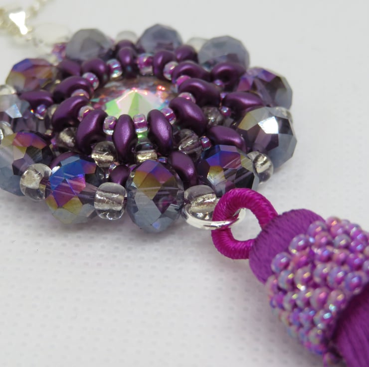 Purple superduo beads, seed beads and crystal rondelles form a frame for a shiny AB coated rivoli in this pendant. The crystal rondelles around the outside of the pendant also have an AB (aurora borealis) coating for extra shine and rainbow colours. There is also a tassel with peyote beading for extra decoration - and a bit of fun! The pendant measures 3.5cm in diameter and from the top of the pendant to the bottom of the tassel is 12cm. This piece hangs from a silver plated bail and has a long silver plated rolo chain with a simple lobster claw fastening - the chain is 70cm long.
