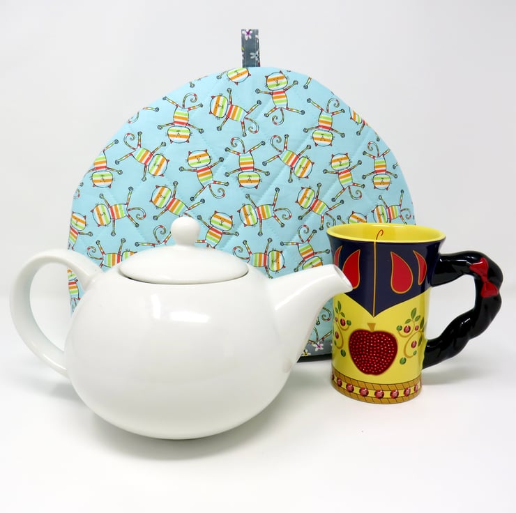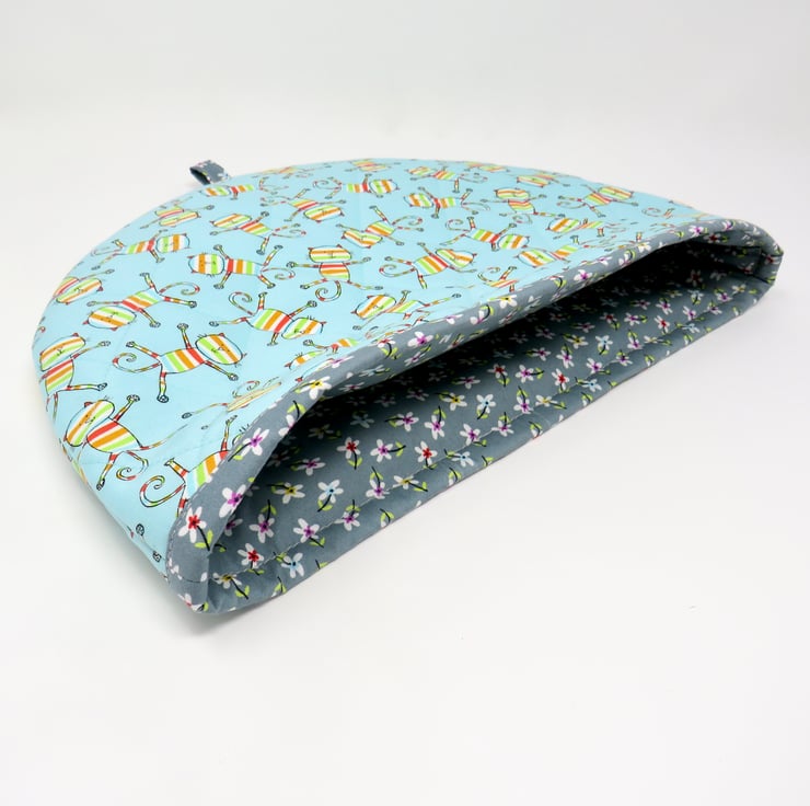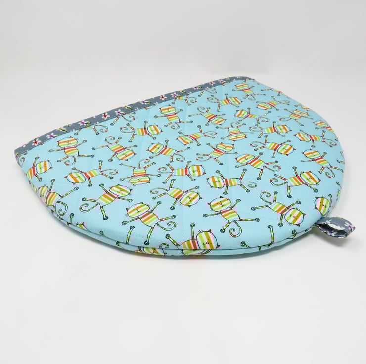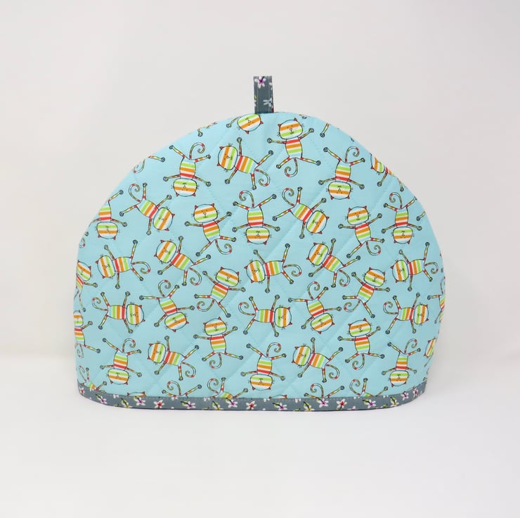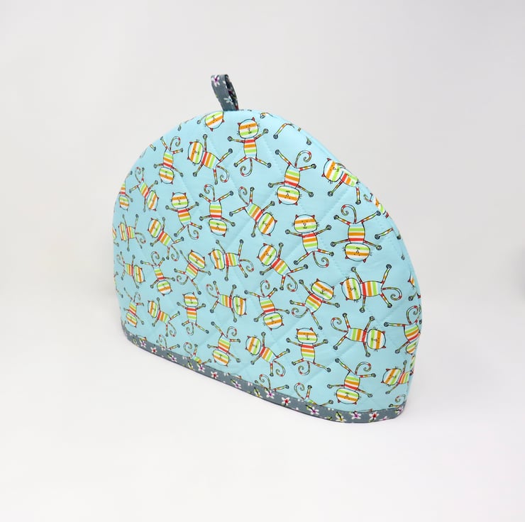 This fun tea cosy is handmade in a turquoise cotton print featuring comical cats and is quilted on the outside. It's lined in a grey ditsy print and has a layer of wadding to help keep your tea nice and hot. The cosy measures 36 cm x 26 cm and will fit a large tea pot.