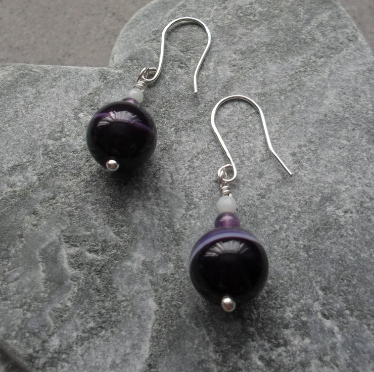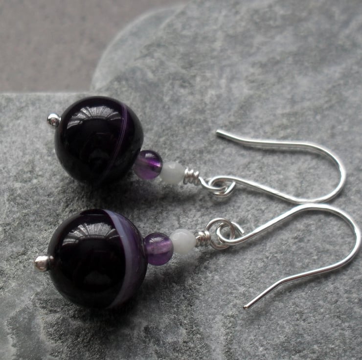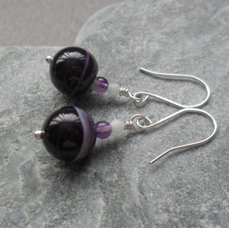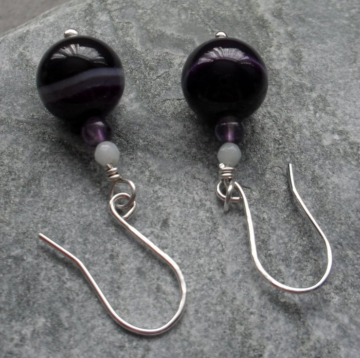 These earrings have been made with deep purple agate amethyst and amazonite semi precious gemstones attached to Argentium Silver which is hypoallergenic handmade ear wires and head pins