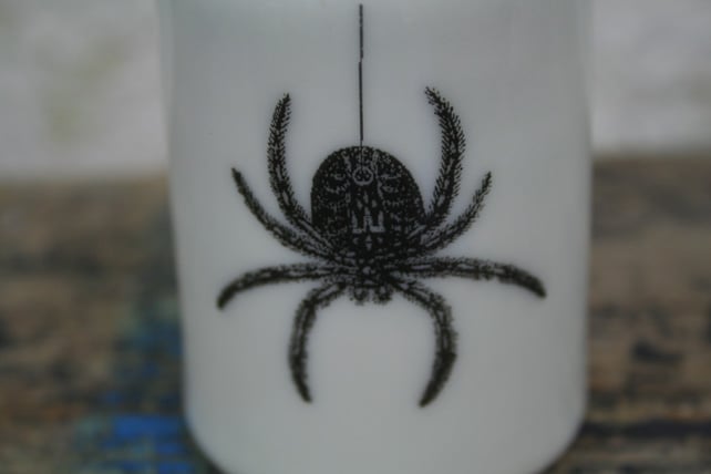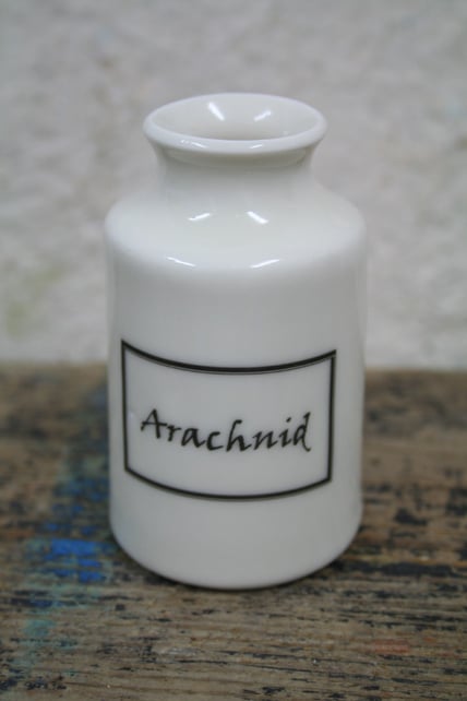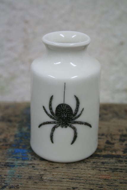 A small porcelain bud vase with a spider image on the front and a specimen label 'arachnid' design on the reverse. Hand thrown on the potter's wheel, then glazed inside and outside but not on the base. Porcelain clay is fired at very high temperatures and the clay is fully vitrified with the glaze making it completely watertight. The spider transfer is a third firing at 800 degrees centigrade and is permanent. The bud vase measures approximately 9cm high, 5.5cm diameter at the base and 2.5cm opening. Perfect for holding several flower buds or plants.