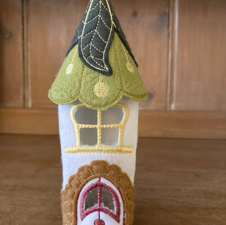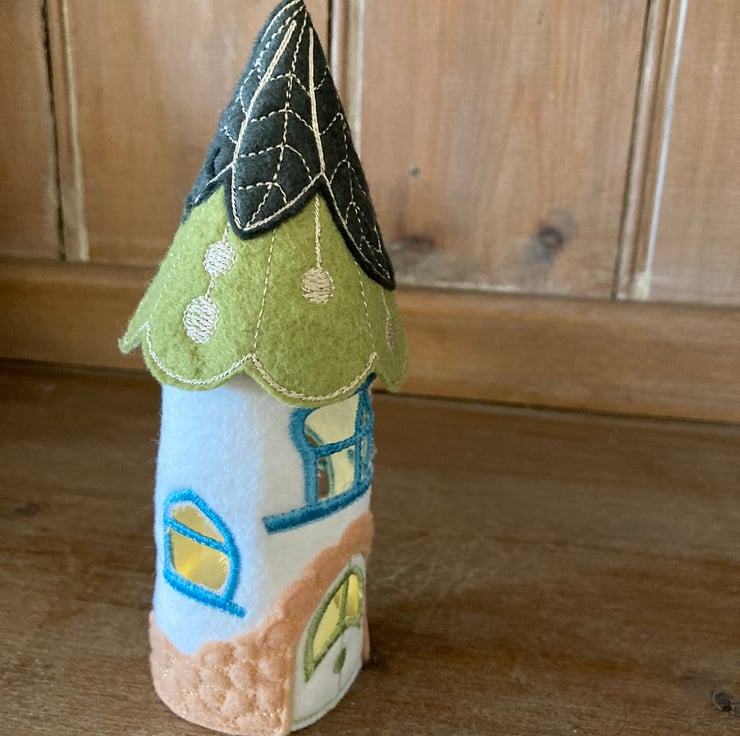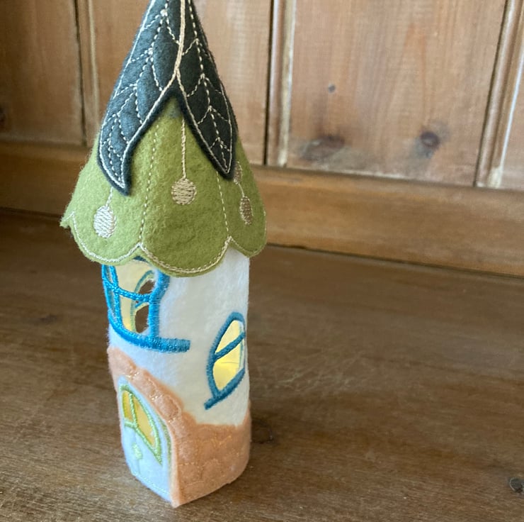 Cute embroidered felt tea light house. Uses battery tea light, not a real flame one. A new tea light is supplied, and has a replaceable battery. Perfect for a nursery, playroom, Christmas, or, just because we all love the magic of fairies.