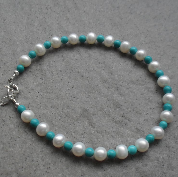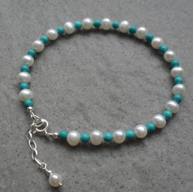 Stabilized turquoise and cultured freshwater pearls have been beaded together to make this bracelet with sterling silver clasp and small extender chain