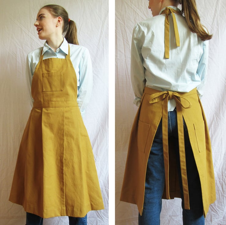 Eye catching pleated canvas apron, attractive yet extremely functional workwear for potters, artists and makers - sure to attract admiring glances in the studio! Lovely warm ochre colour cotton fabric is tough and washable. The pleated skirt and overlapping split gives generous coverage ensuring each leg is well covered when sitting at a potters wheel, work bench or easel. Beautifully sewn, thoughtfully designed and made-to-last, this apron is highly specialised craftsperson's workwear.
