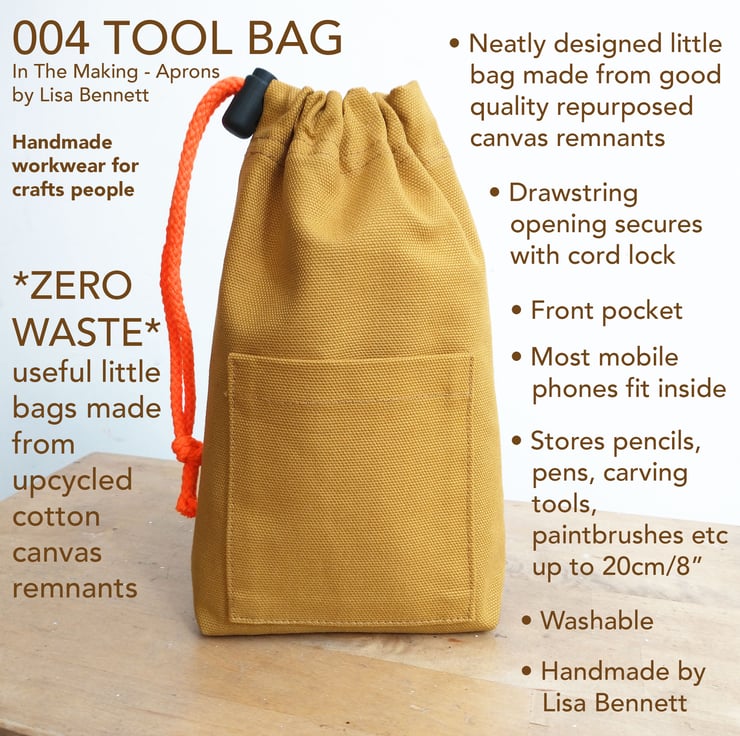 Pair your ochre apron with a matching canvas drawstring bag for your pottery tools- these handy little bags are made from remnants of canvas leftover from making aprons.