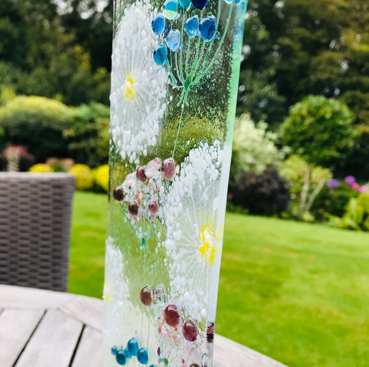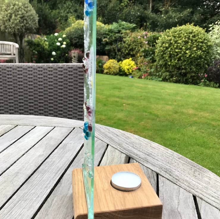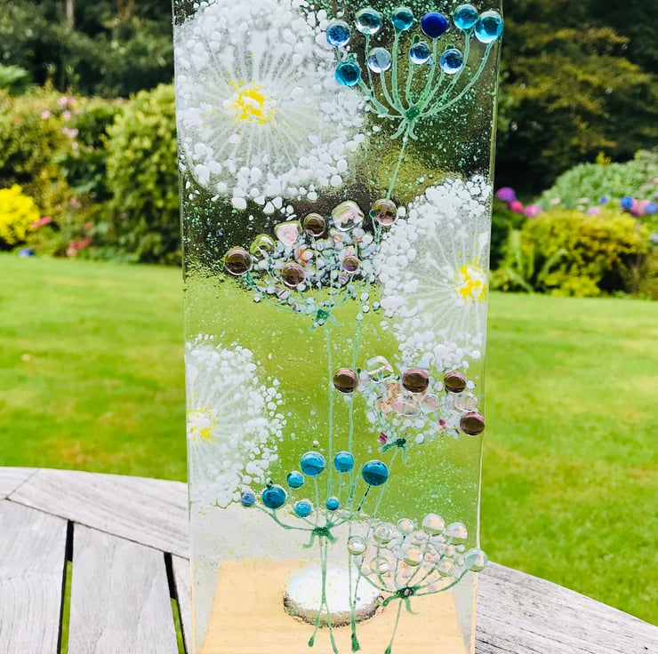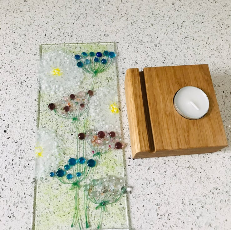Fused glass dandelion make a wish panel which mounts in an oak stand. The oak stand has a recess for a candle so not only will it look stunning in the day but also by night lit up in candle light . I love dandelions and associate them with blowing and making a wish hence my “make a wish range”.