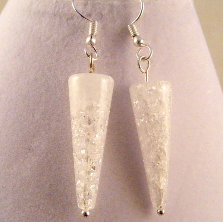 I've handmade these one of a kind earrings with, 30 x 10 mm clear crackled quartz gemstone drops, silver plated headpins and ear wires.