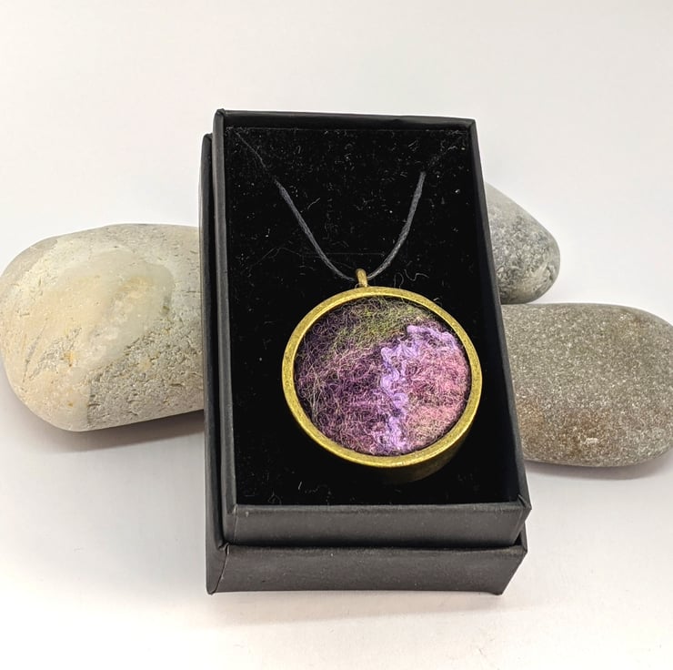 The pendant is a melange of wet felted merino wools, firmly attached to an open bronze coloured bezel. This particular pendant is embellished with lavender silk fibres.