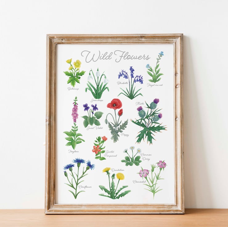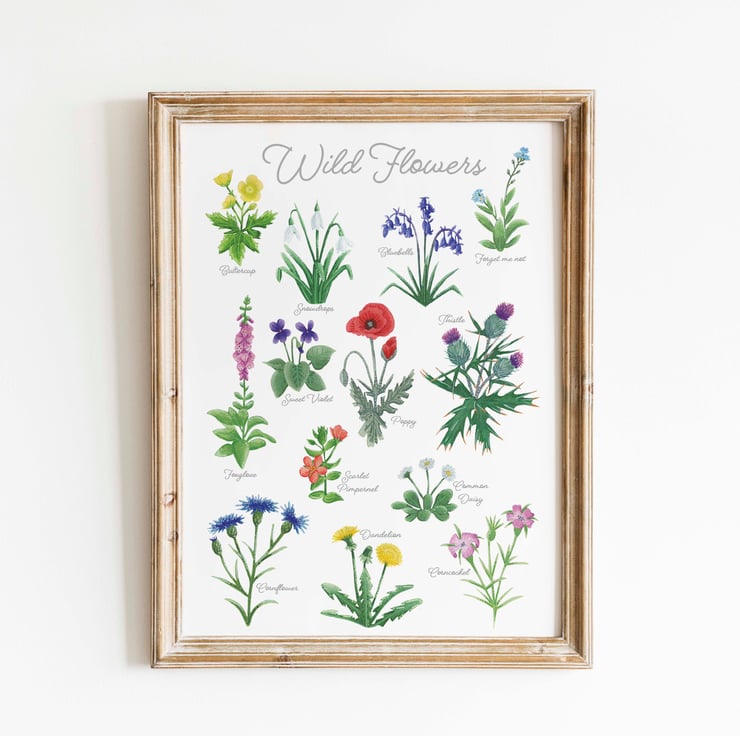This British wild flower print is of lots of bright vibrant British wild flowers from daisies and dandelions to poppies and foxgloves. Each flower with their names written next to them. Each flower has been hand painted with Winsor and Newton Cotman watercolours, with gouache for the light on dark details on top.