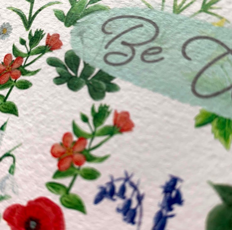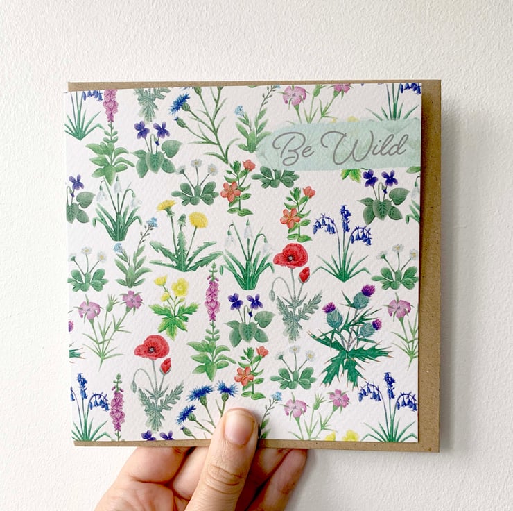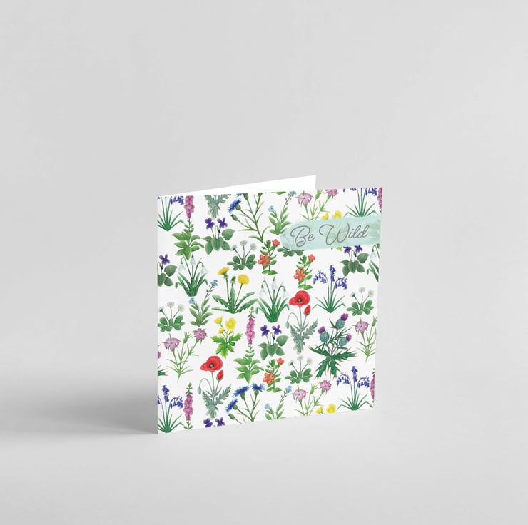 This British wild flower be wild birthday card has lots of British wild flowers on the front and the 'Be wild' written in the top right hand side as to not cover the flowers too much. The flowers have been hand painted using Winsor and Newton Cotman watercolours and gouache for the light and shadow details. The card is high quality printed on to 300gsm Tintoretto Gresso card thats gives the look and feel of watercolour while keeping the brightness of the print. This square card measures 148mm x 148mm, comes with its own Kraft paper envelope and has been placed into a clear environmentally friendly compostable sleeve to protect it.