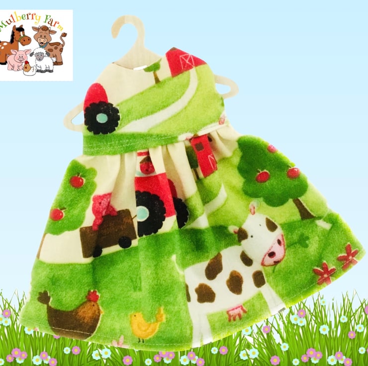 An adorable little dress in a farm print fabric to fit the Mulberry Green characters. The dress is made from best quality cotton, has a full skirt and a lined bodice and comes on a cute little wooden hanger.