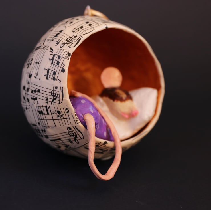 They're made using traditional paper strip and paste papermache technique. Individually hand painted and decoupaged on the outside using old sheet music. It hangs on a gold satin ribbon.