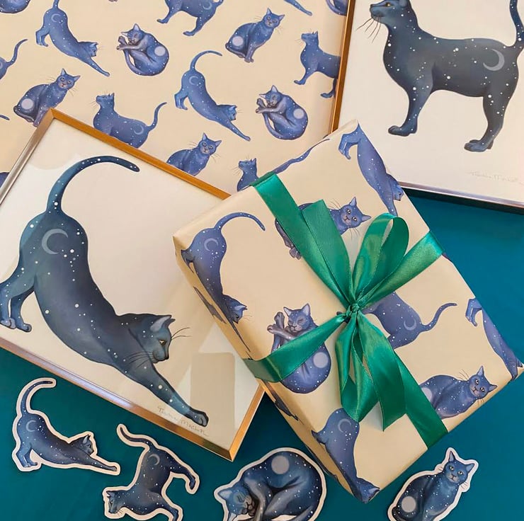 I created this elegant "Lunar Cats" gift wrap using a combination of chalk pastel, coloured pencil and digital illustration to bring it all together as a pattern!