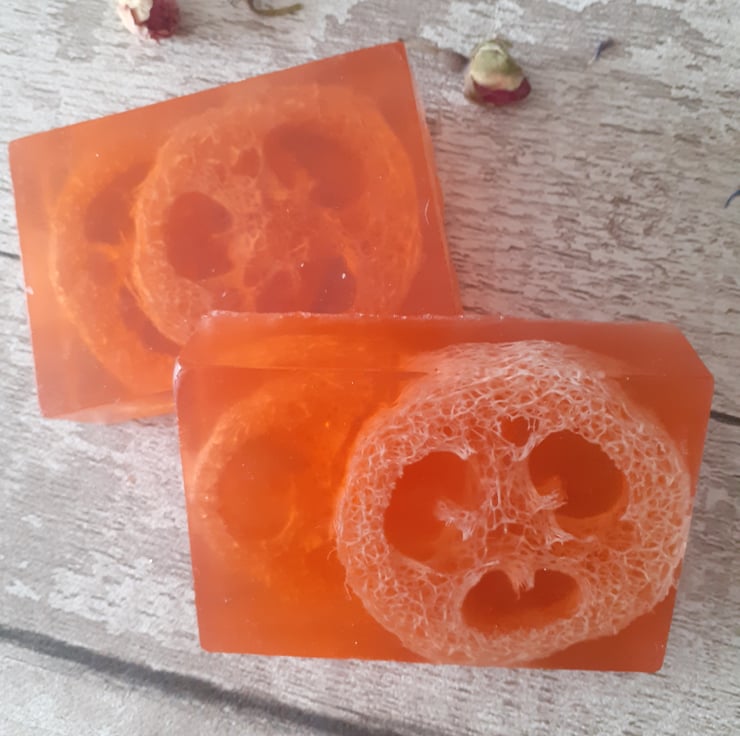 Two fragrant handmade glycerin soaps, with natural exfoliating loofah slices, and fragranced with the soothing and warming aroma of ginger and clove essential oil.