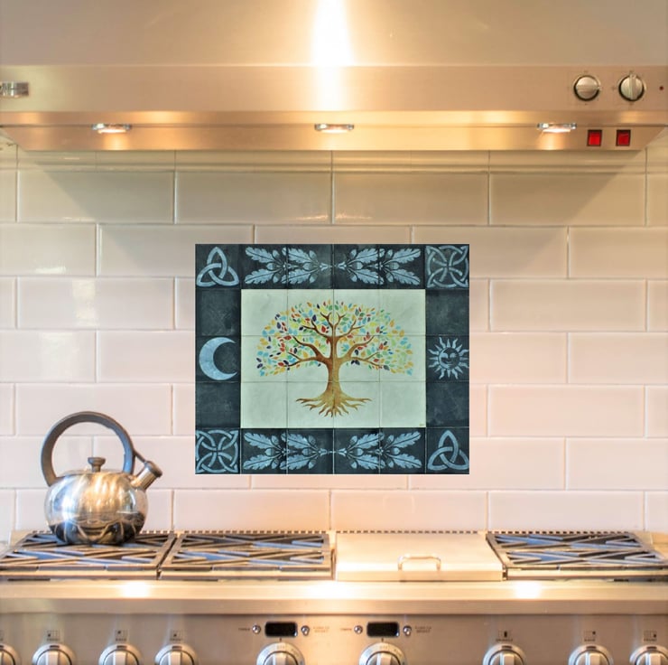 This is a unique hand-painted Tile Backsplash of a Tree of Life with a decorative grey border.