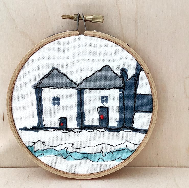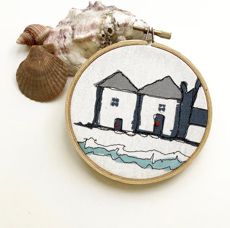 This image shows two coastal cottages next to the sea. Free motion embroidery has been added. Two red, French knots have been used for the doors. The blue, grey and red colours conjure up memories of seaside holidays.