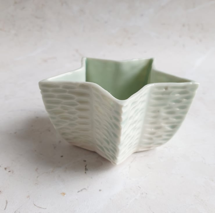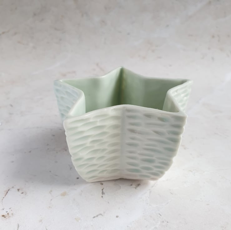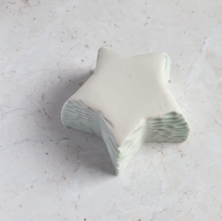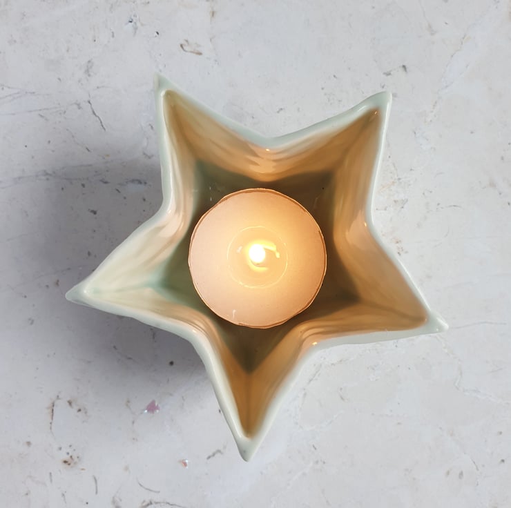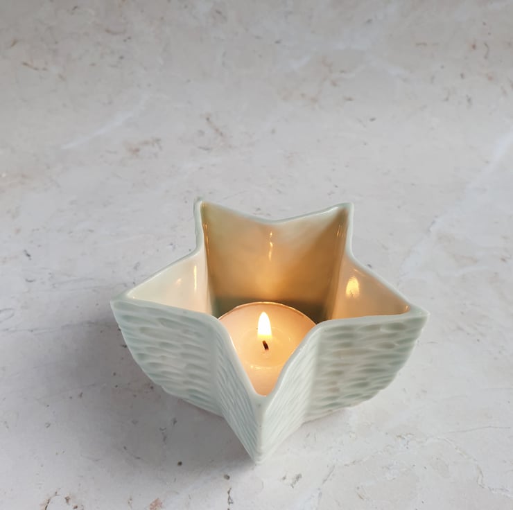 Star shaped tealight holder with a pale celadon glaze. Inspired by ripples on water.