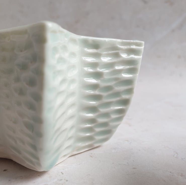 Handmade using porcelain with texture carved into the clay. Using porcelain means that the candle light diffuses through the carvings. This is a particularly difficult shape to make and is more prone to failure, which makes each one even more special when it survives the making process.