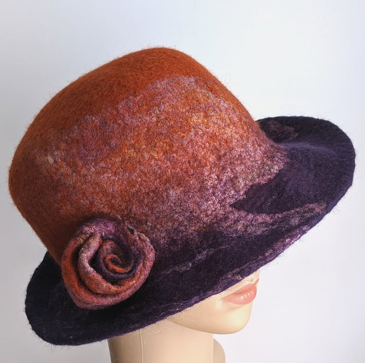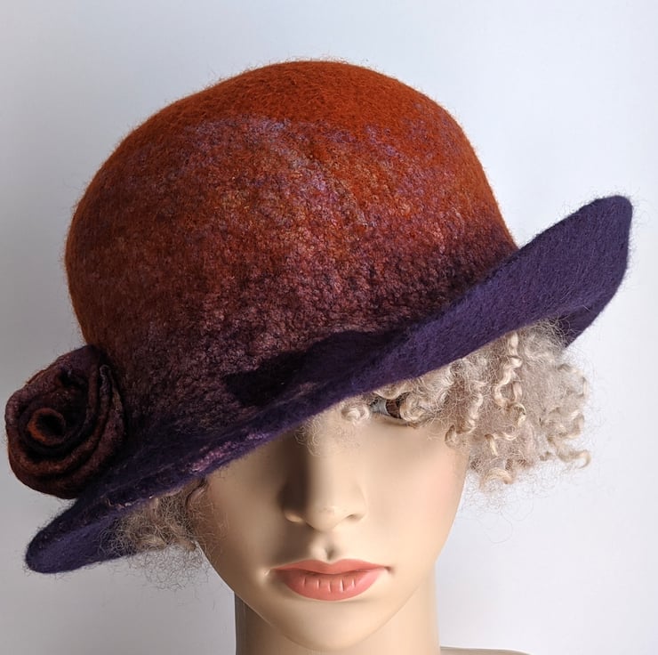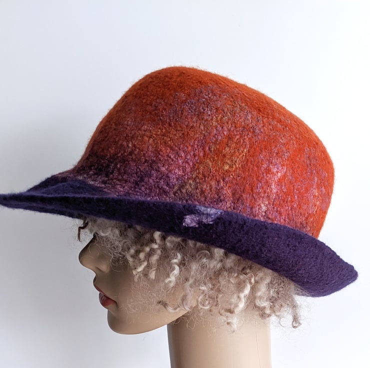 A breton style hat with a rust crown blending to a royal purple brim, overlain with toning hand dyed silks.