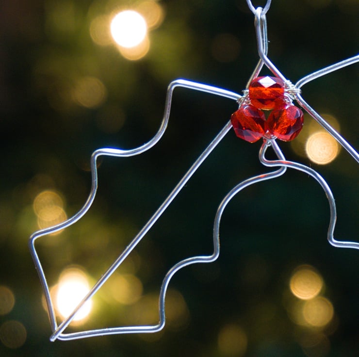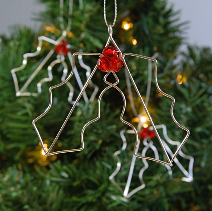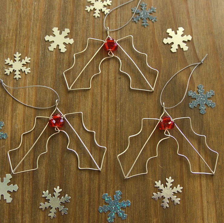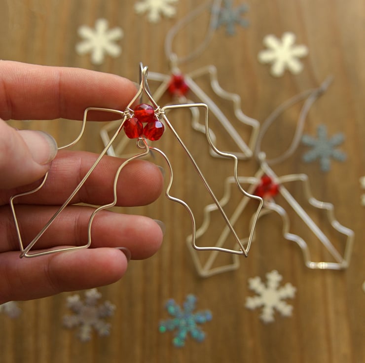 These beautiful Holly Leaf decorations have been completely handmade from silver plated copper wire and faceted glass beads. I've formed the double leaf shape by hand and then attached the three red 'berries' with fine wire. The silver plated wire is non tarnish so it will retain it's bright shine, with the facets on the beads catching the light, meaning they will sparkle slightly next to some fairy lights. These gorgeous decorations would make the perfect addition to your festive decor!