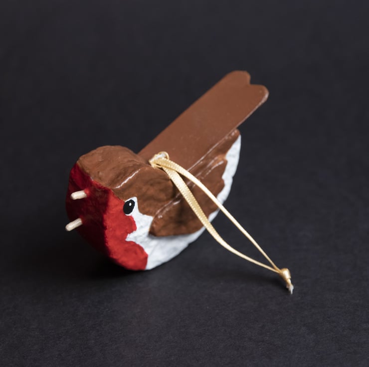 These sweet little birds are made using a traditional moulded paper pulp papermache technique with wooden beaks, they are handpainted and finished with varnish for longevity, and hang on a gold satin ribbon.
