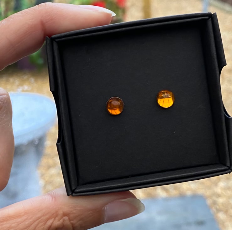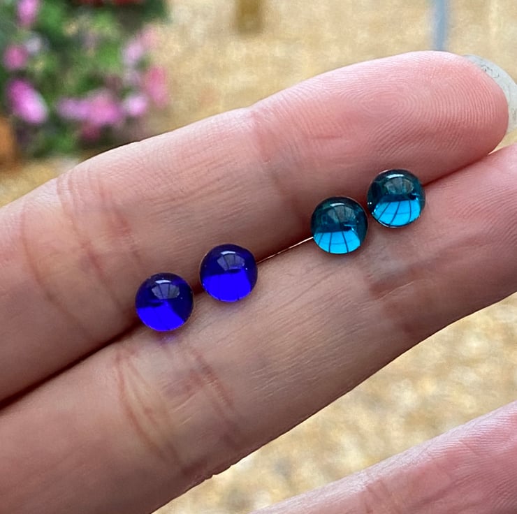 6mm Glass cabochon on 6mm sterling silver flat pad studs and fastened with sterling silver scroll backs.