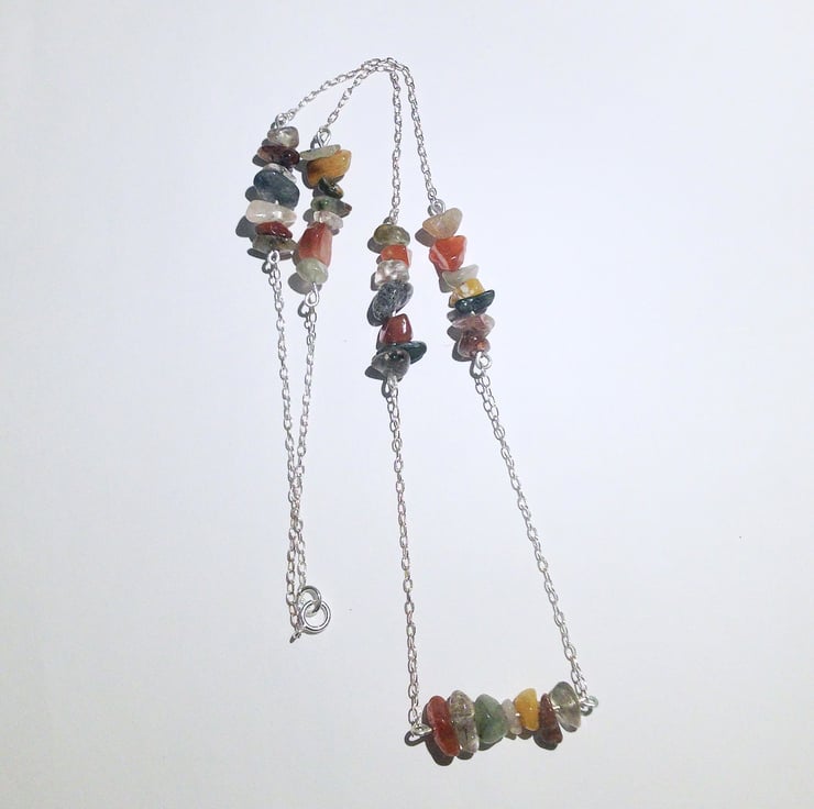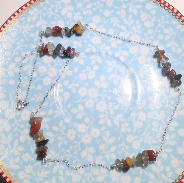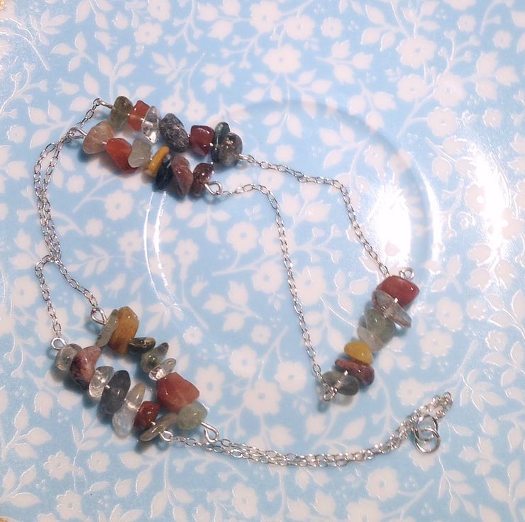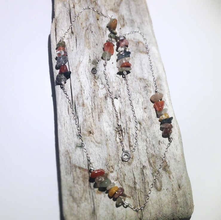This beautiful hand crafted necklace is constructed from tourmeline in quartz and carnelian gemstone chip beads strung on sterling silver wire and interspersed with sterling silver chain. The necklace measures approximately 21 inches (53 cm).