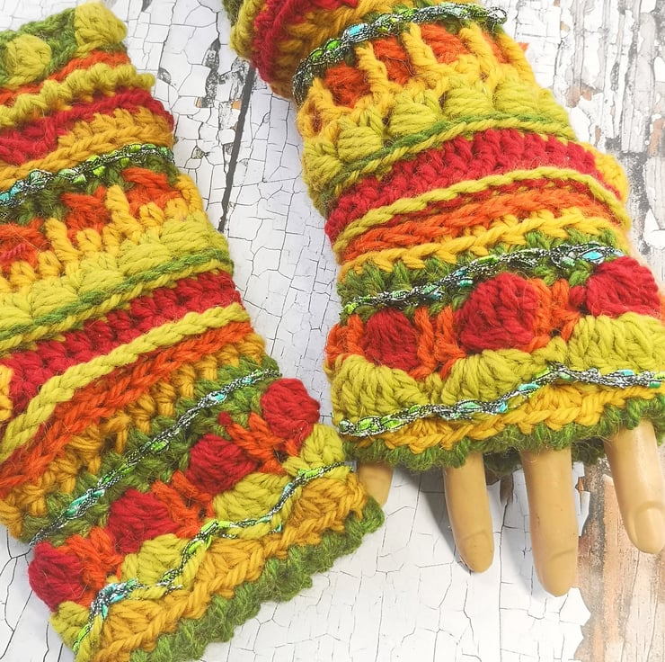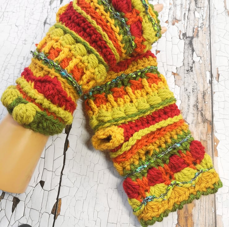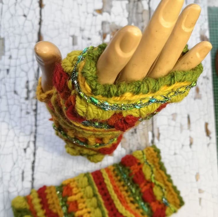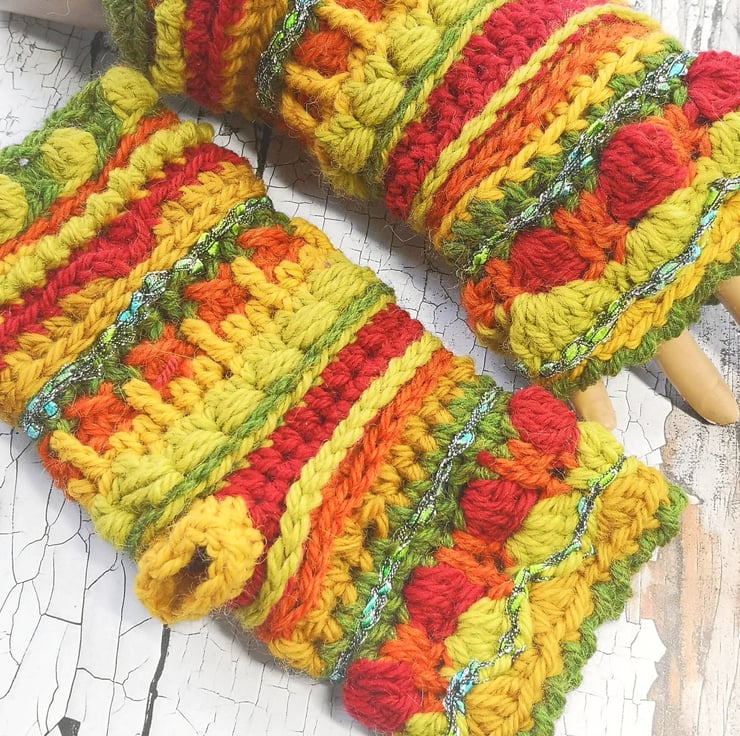 Gloriously snug wrist warmers hooked in autumnal colours of spicy orange, deep reds, mustard yellow and various greens. Perfect gloves for those who connect deeply with the season, and adore walking in the chill Autumnal air, the leaves crisp underfoot, the chittering squirrels running up and down tree trunks with acorns and conkers.