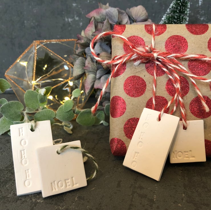 Tags are stamped with the words “Ho Ho Ho” and “Noel”.