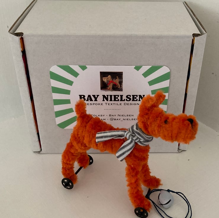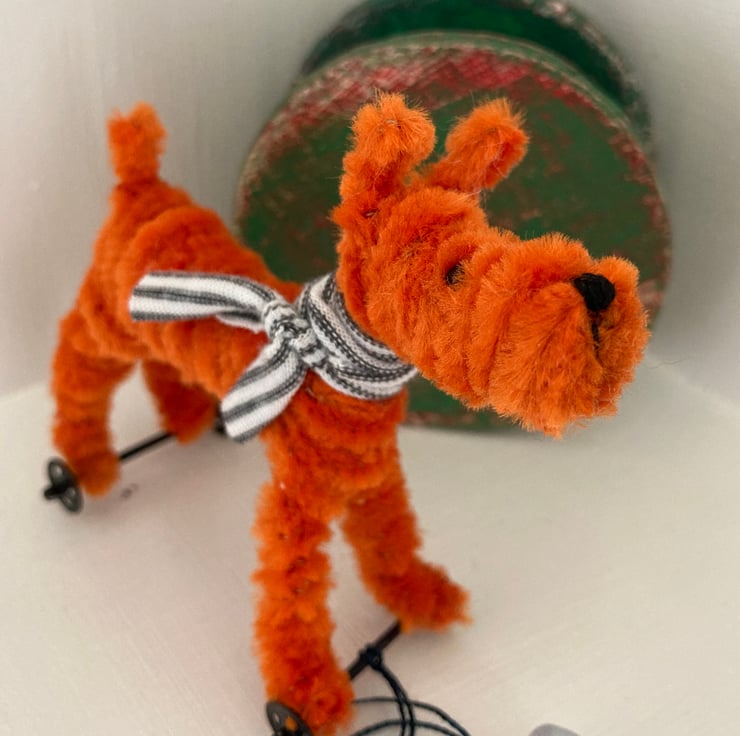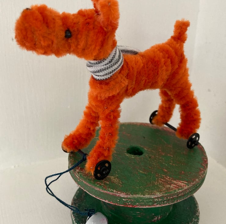 OOAK sculptured miniature dog on a pull along wooden trolley with wheels. All my animals are hand finished with eyes and noses and ,if needed, wool whiskers! The wheels are for decorative purposes only and do not turn. My animals are not toys but are designed as small pieces of art for display on a shelf - somewhere where they will be admired and loved. Each little guy or gal will come boxed and with a little story about their past exploits!