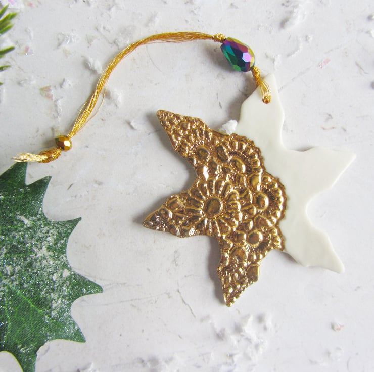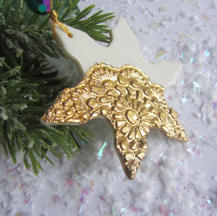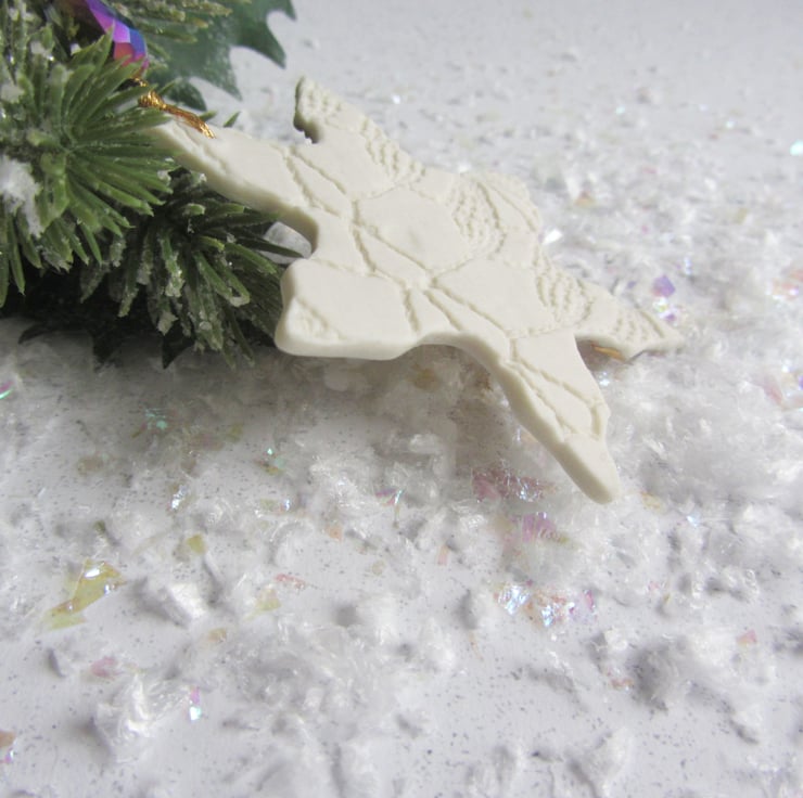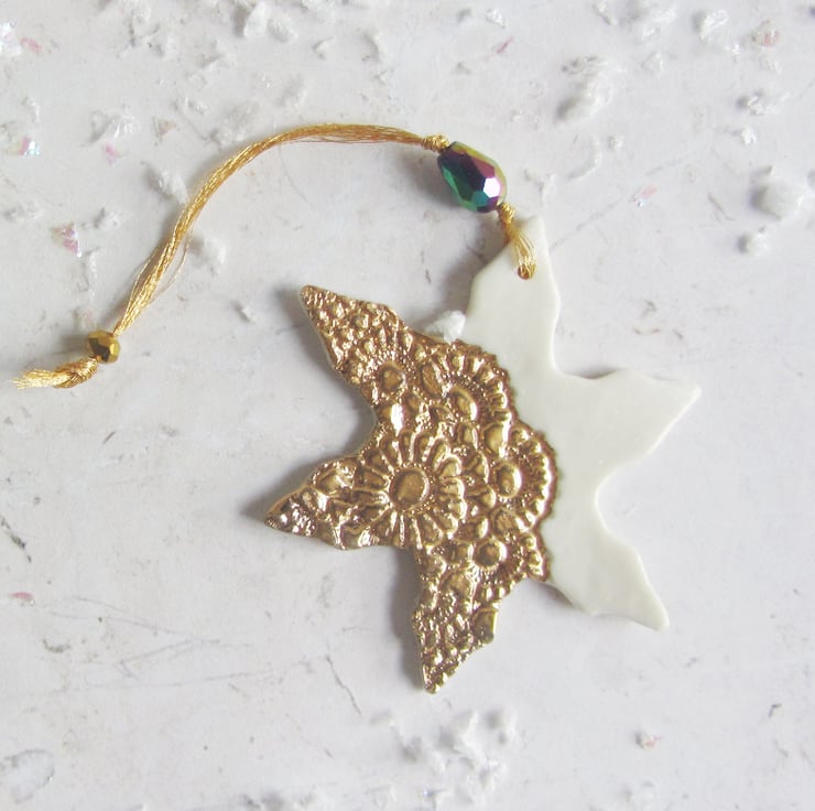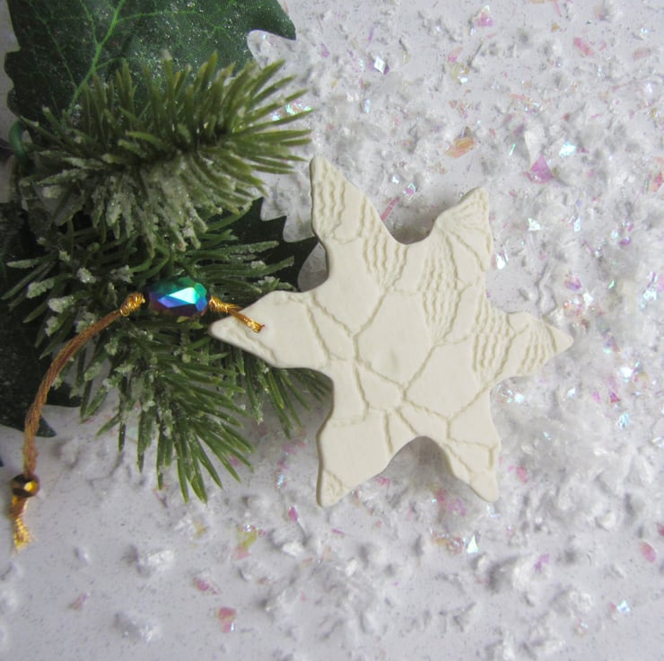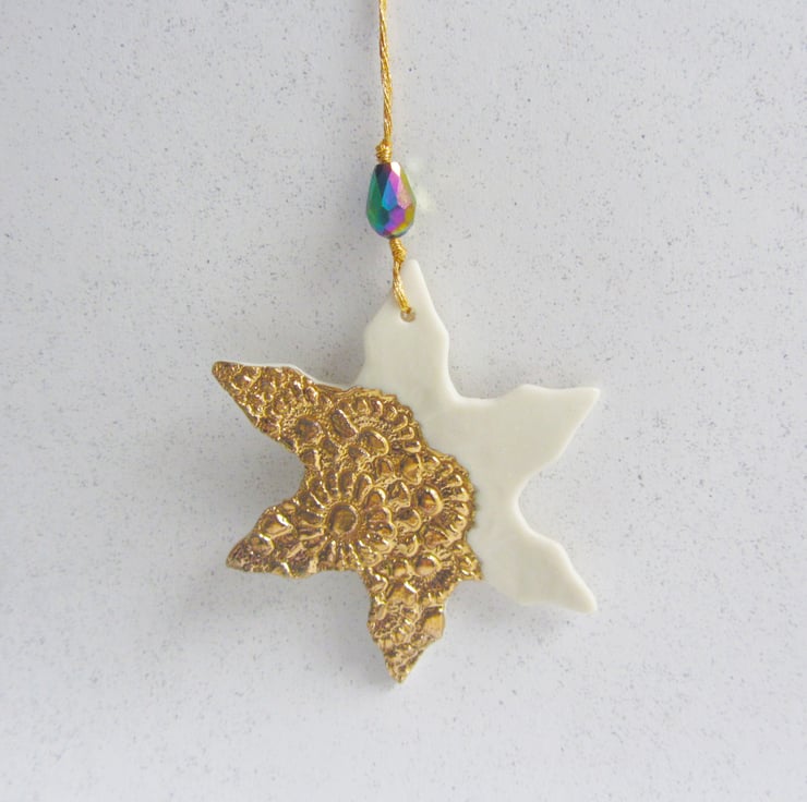 This is a fine porcelain snowflake that has been imprinted on both sides with lace, before going through its first firing. It is then glazed, and has its second firing. Finally, each decoration is hand painted with 22ct gold lustre to give a high shine finish and goes through a third and final firing.