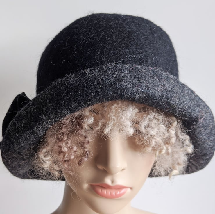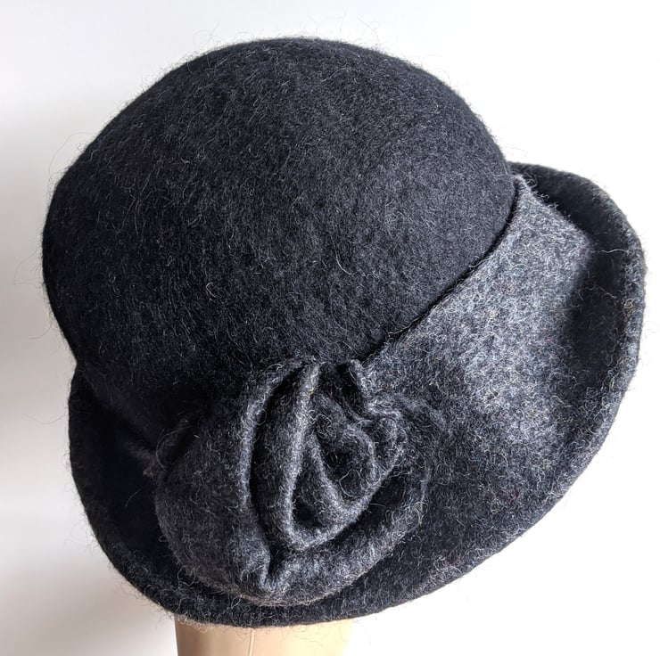 A breton style hat with curved tweedy mottled dark grey brim, with a black crown, and matching flower trim.