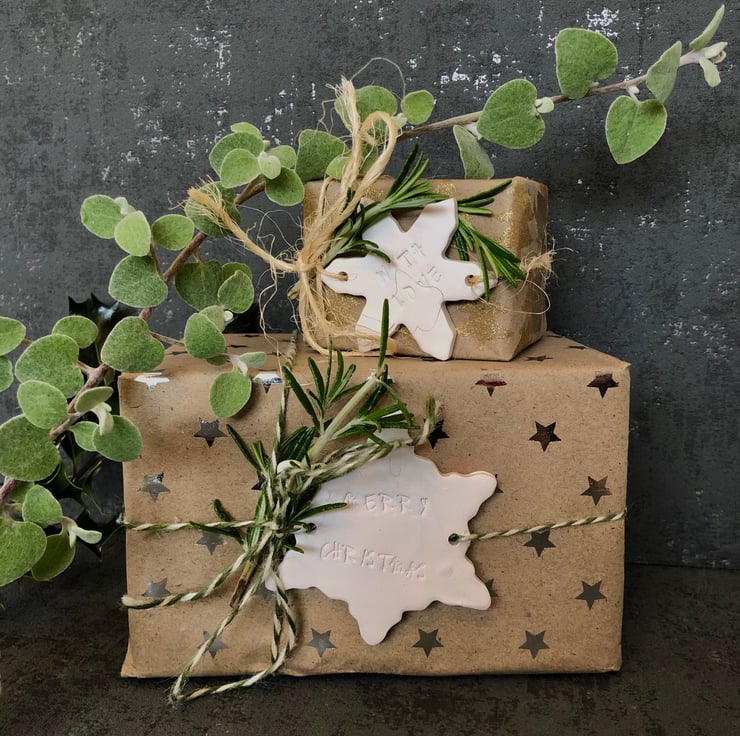 One small and one large ceramic snowflake gift tags made with a crisp white earthenware clay, and strung with a seasonal green striped twine.