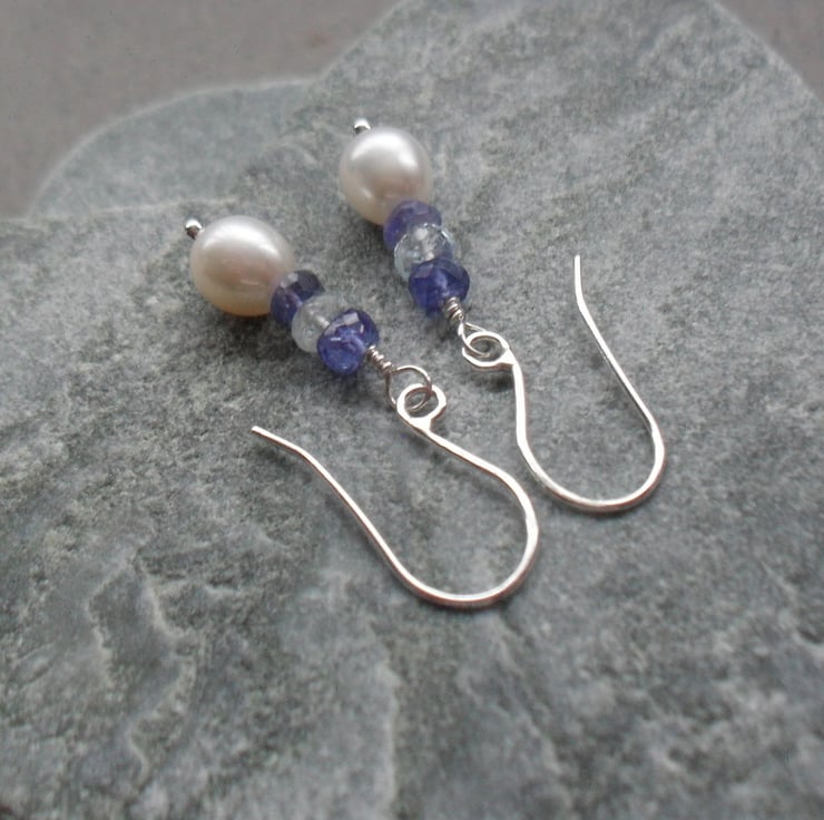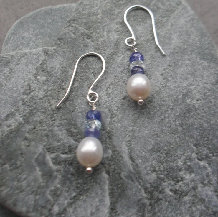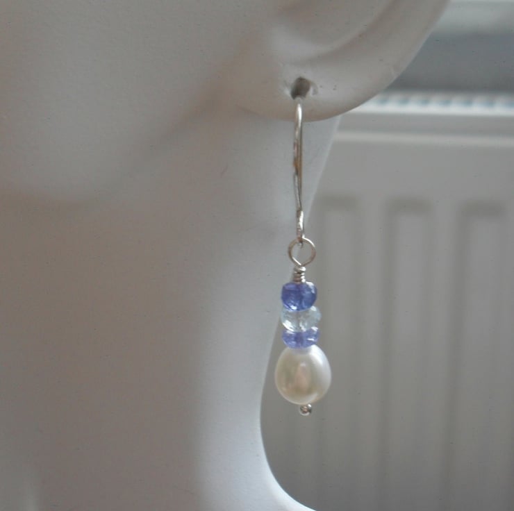 These earrings have been made with freshwater cultured pearls tanzanite and sky blue topaz gemstones which have been attached to Argentium Silver which is hypoallergenic handmade ear wires and head pins