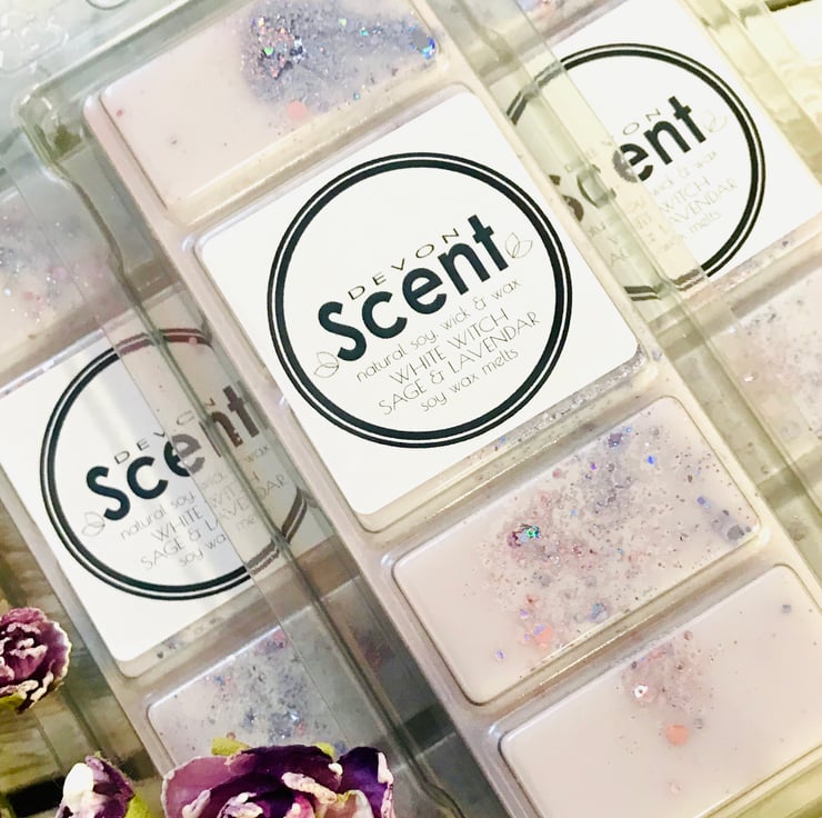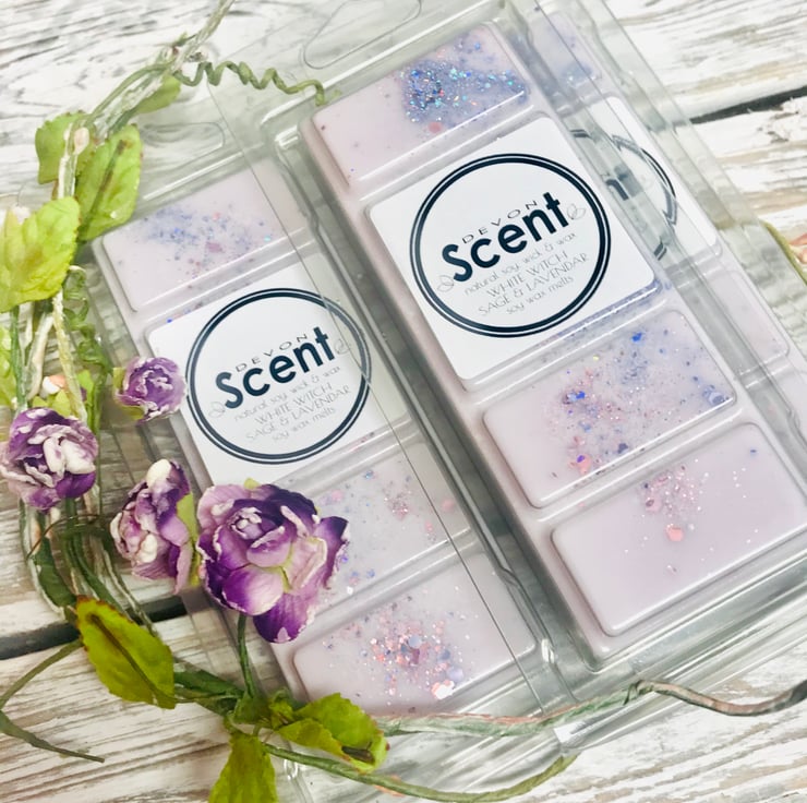 Our highly fragranced White Witch - Sage & Lavender Snap Bar Wax Melts start with top notes of lemon, freesia, lime and rosemary, mid notes of jasmine, mimosa blossom, violet leaf and lavender followed by base notes of vetiver, musk, ambergris and white sage.