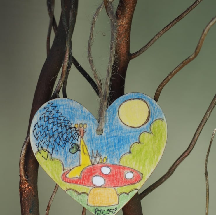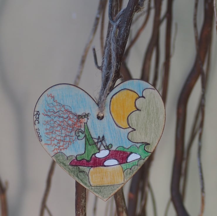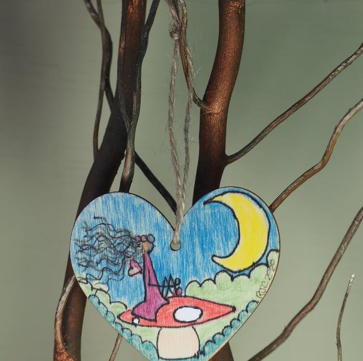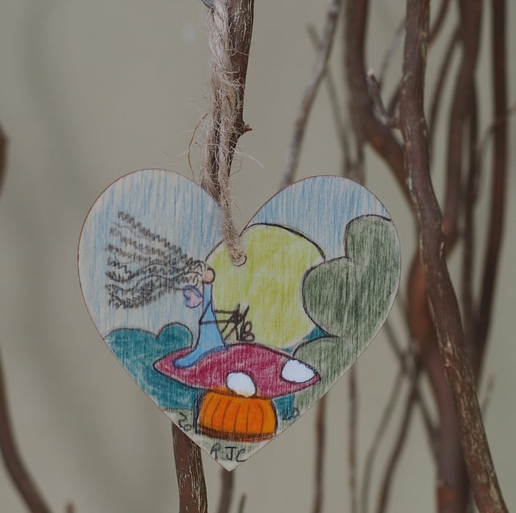 Brightly coloured hand drawn Fairy on a wooden heart shaped hanging decoration.