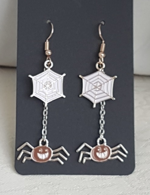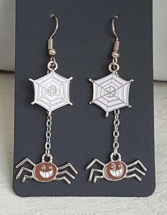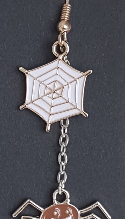 Gorgeous enameled charms dangle from Rose gold tone ear wires and silver chain. The Spiderweb charm at the top is white enamel on a light gold tone metal charm and the dangly spiders are a Brown enamel on a light gold metal. An unusual and quirky mixed metal/tone pair. Fab as a spooky gift or for those who love spiders. (me!).