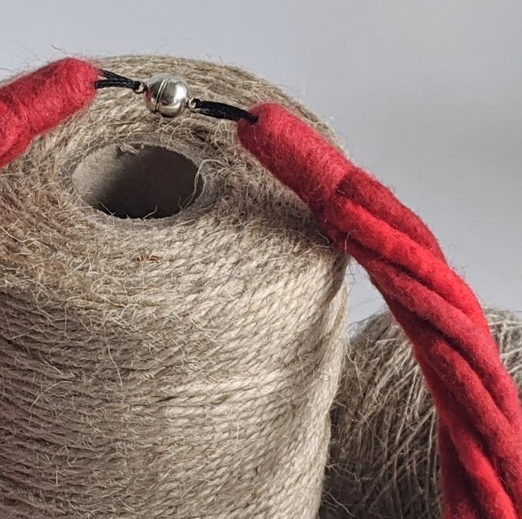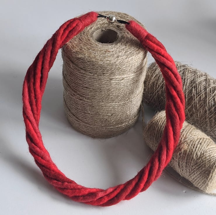 This handmade wet felted necklace twists together 6 fine felted strands of soft merino wool, in toning shades of red. It closes with a strong magnetic fastening.