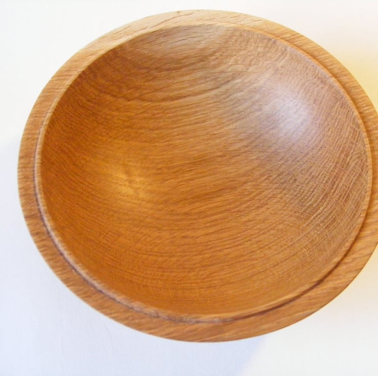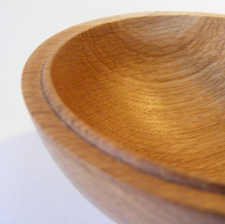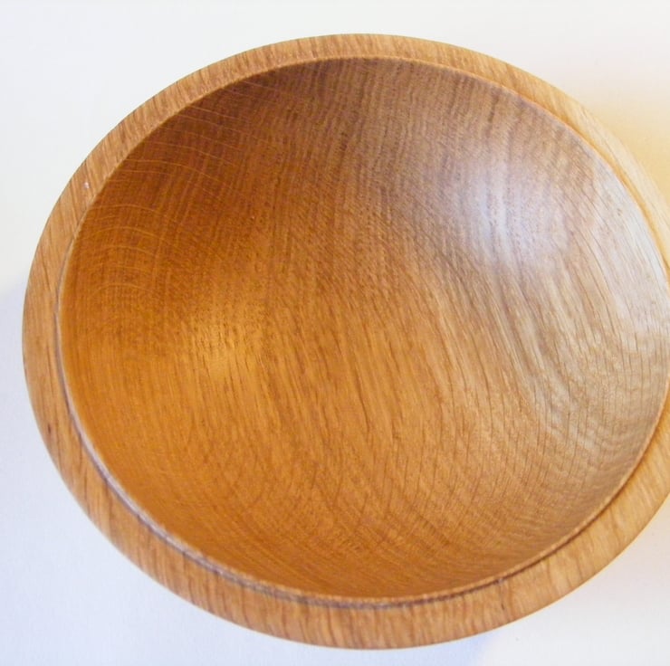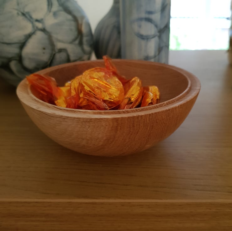 Small Oak nibbles bowl, 118 x 46mm approximately, finished in food safe oil. Lovely piece of quality Oak, with a nice grain pattern and a hint of lighter sap wood to one side, the rim has a small bead detail. The piece is finished on the inside in food safe oil making it perfect for nibbles such as sweets, crisps or nuts or could be used for storage or decoration.