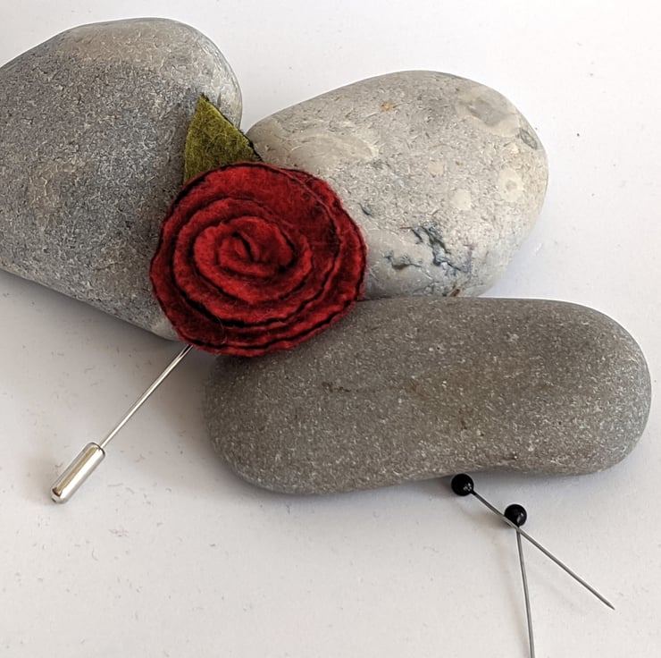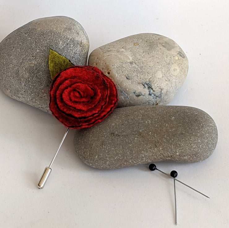 Small handmade, art deco inspired rose lapel pin or brooch, fastened with a secure hat pin.