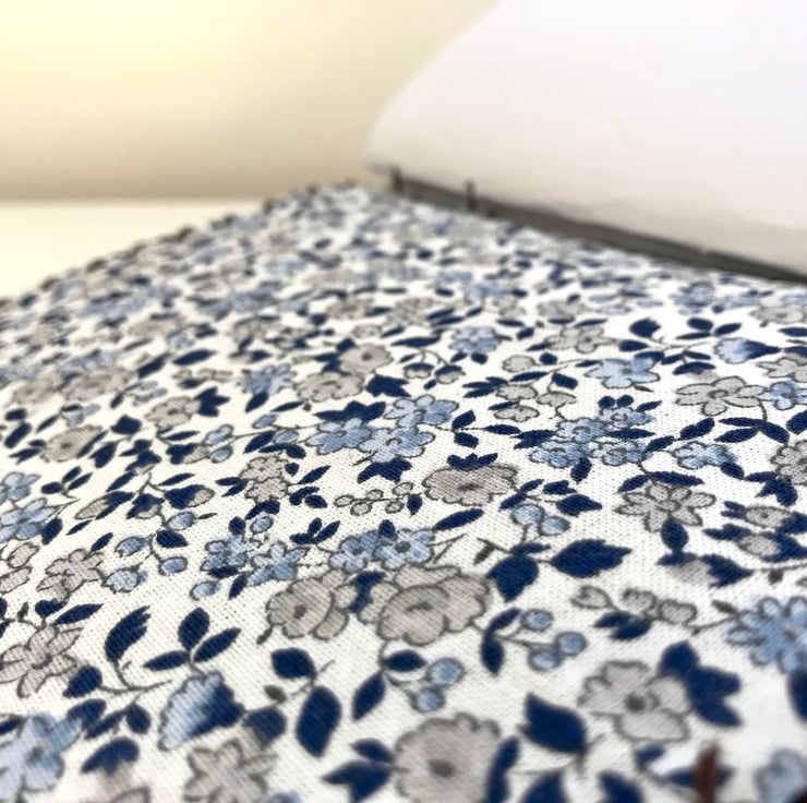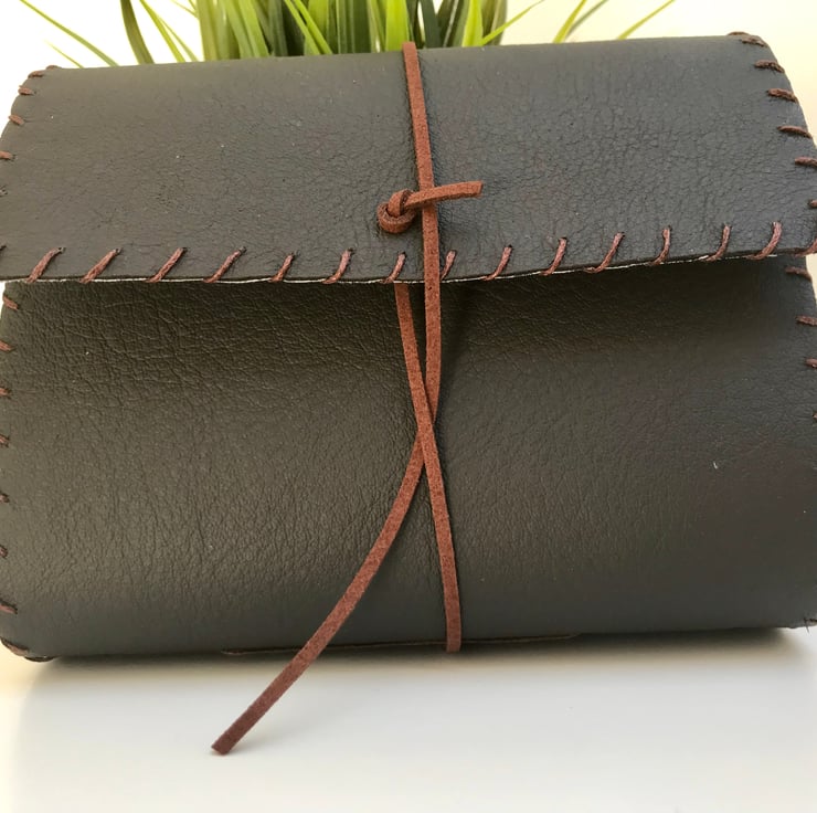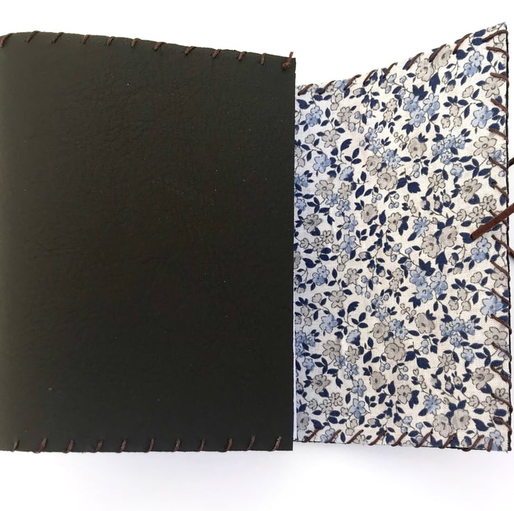 A gorgeous dark brown leather with a pretty navy, white and grey floral material lining. The notebook is hand stitched around the edge and contains 100 blank sheets of 190g white watercolour art paper which are then hand stitched to the leather in 5 signatures. The notebook is fastened with a suede cord, tied loosely at the front.