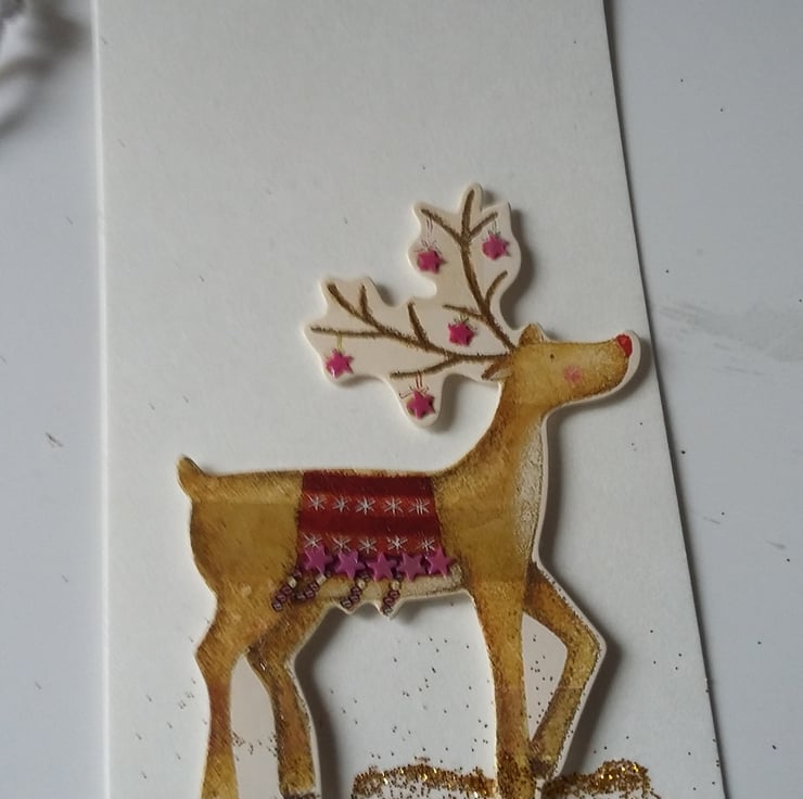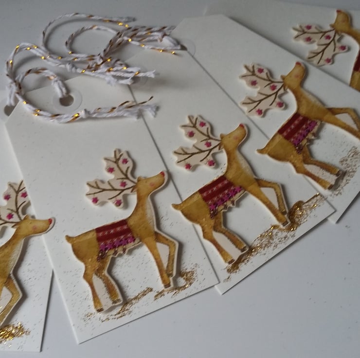 A SET OF FIVE LARGE WHITE CHRISTMAS GIFT TAGS 12CM X 6 CM EACH ONE HAS A RAISED REINDEER EMBELLISHED WITH TINY STARS AND STANDING ON GOLD GLITTER SNOW