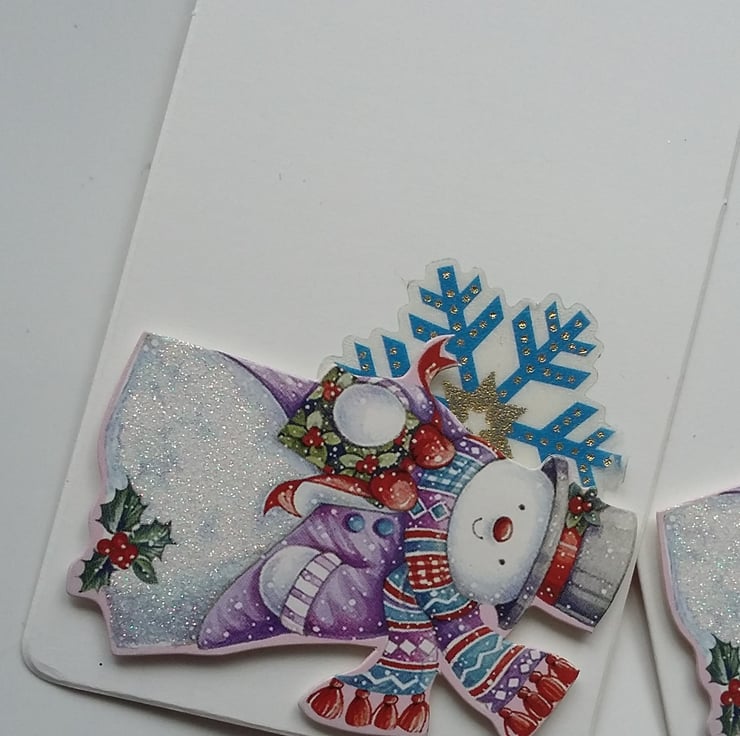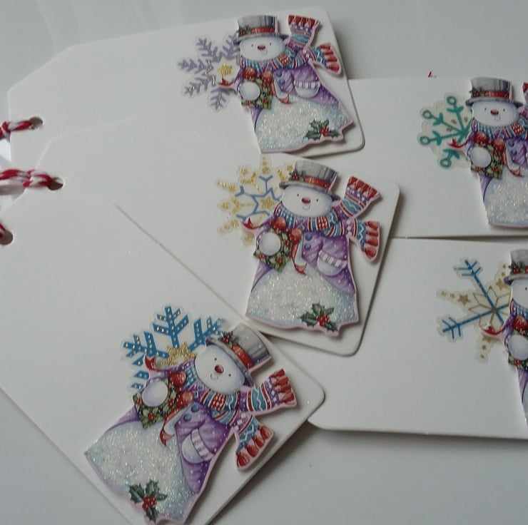 A SET OF FIVE LARGE WHITE 12CM X 6CM CHRISTMAS GIFT TAGS EACH TAG HAS A RAISED SNOWMAN AN A LARGE SNOW FLAKE