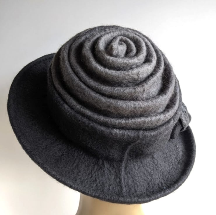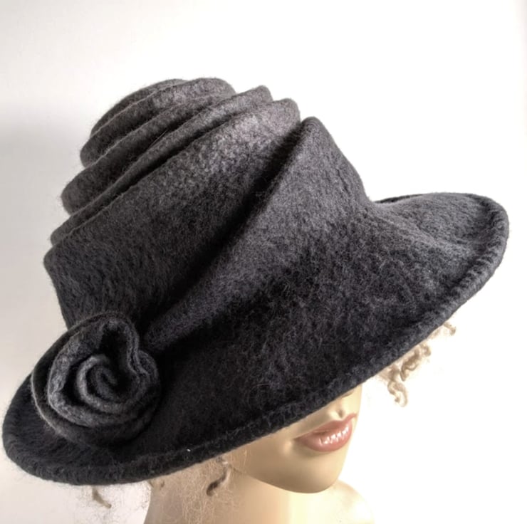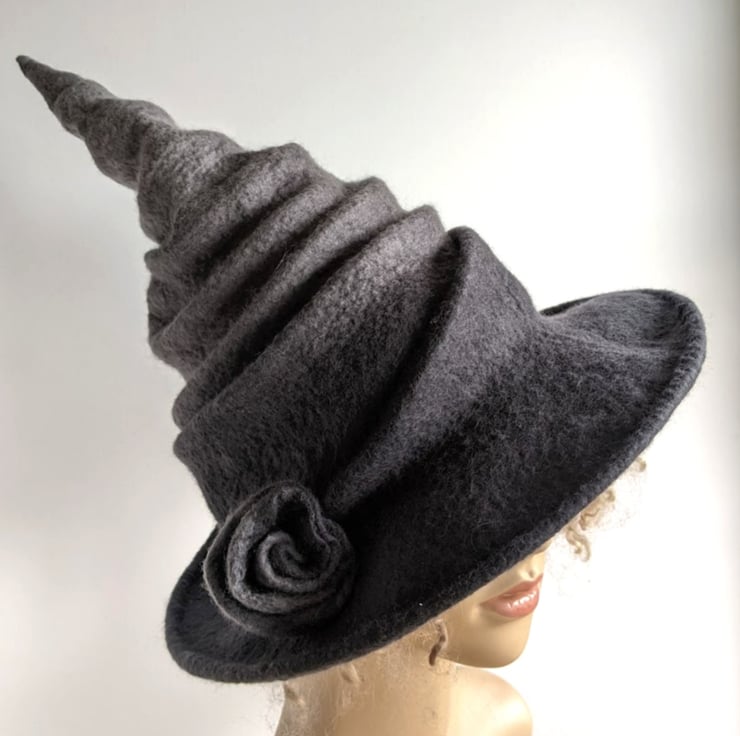 Handmade wet felted 'Secret Witch' hat, shading from charcoal grey brim to lighter grey crown sculpted into neat folds that can be manipulated into various forms!