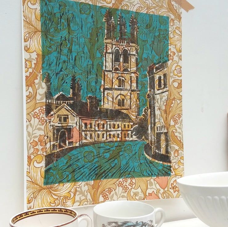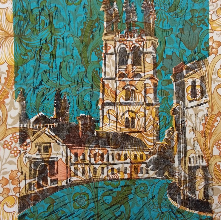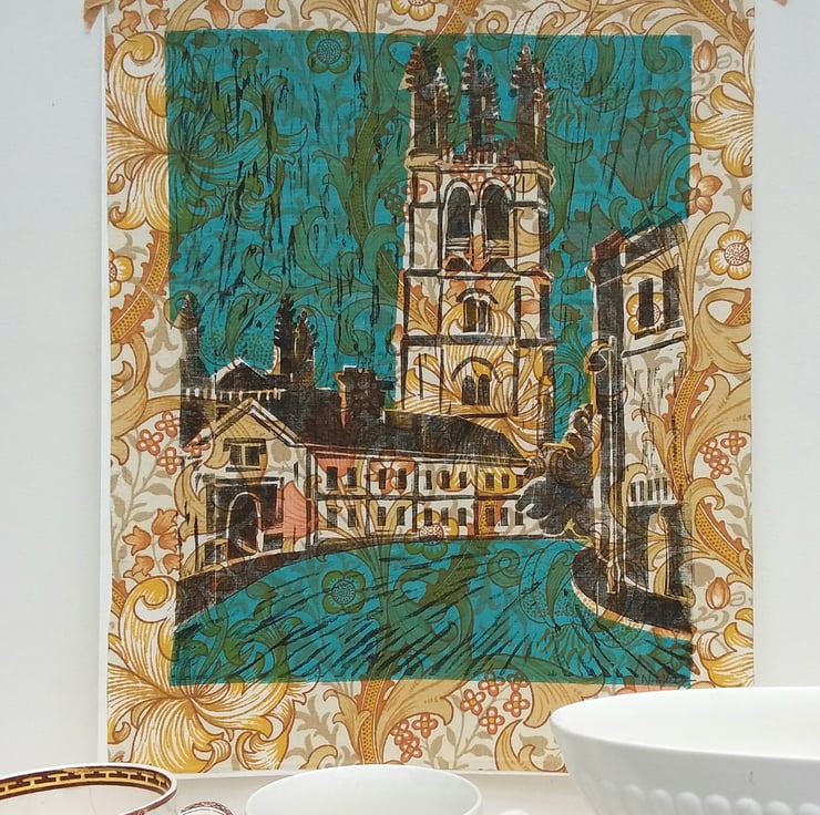I live in one of the most beautiful cities in the world so it was about time that I made some images inspired by the views and buildings I cycle through daily. I like combining and using different printing techniques and enjoy the happy mistakes and blemishes that may occur. I print on a variety of papers and fabrics and for this image I chose a vintage piece of Golden Lily by William Morris in vibrant golds and yellows. I love how the fabric design appears through the blue ink.