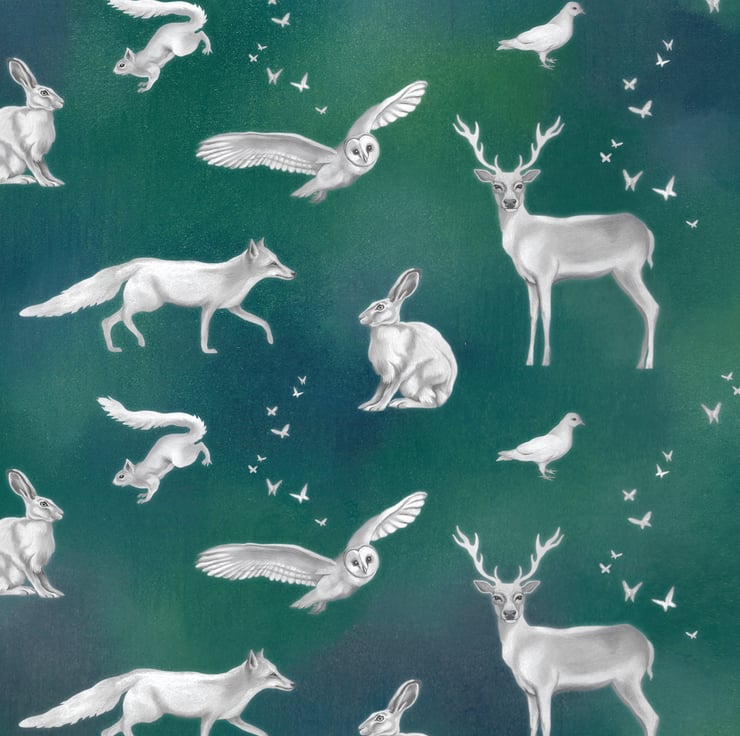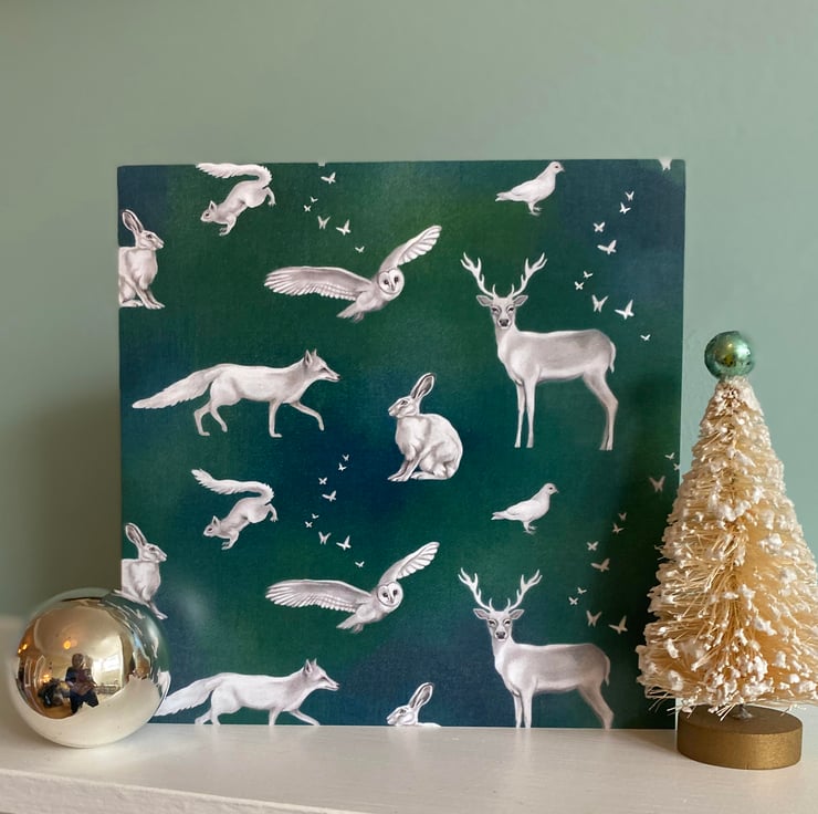 I wanted to create a beautiful matching wrapping paper and card design, and was inspired to create these ethereal woodland animals on a rich forest green background.