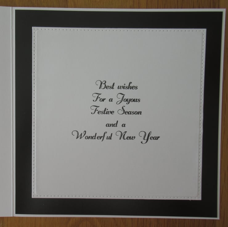 This Luxury Art Deco 8x8 inch card has multiple layers including a background of black and gold foil. The image which has a pearlescent finish for that touch of sparkle is surrounded by a frame which is raised on 3D foam with a gold mirror mat behind it. The inside is finished to coordinate and has a stamped christmas message as pictured.