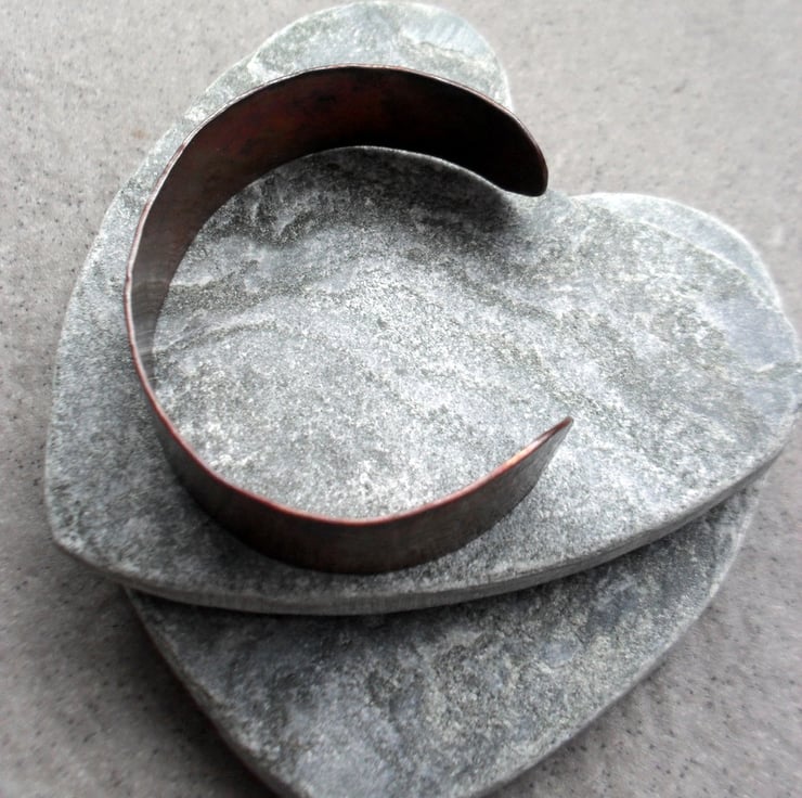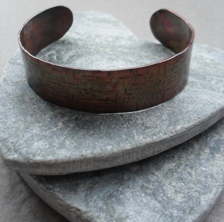 Copper cuff bracelet which has been hand cut from a sheet of copper, hammered to give texture, sanded and oxidised to give a slight aged look with beautiful brown tones with slight hues of red . The bracelet has then had a lacquer coating to protect the patina
