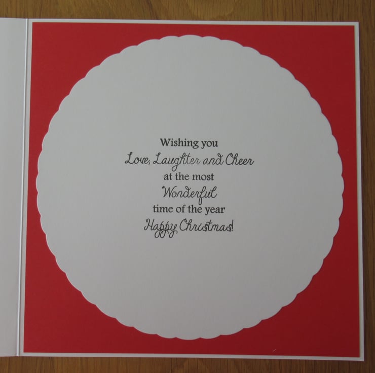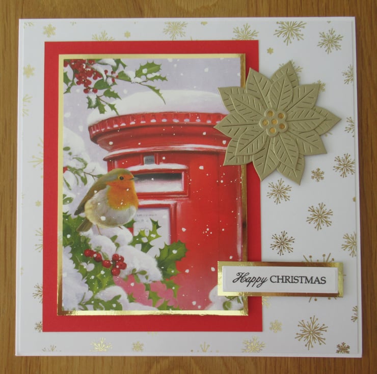 This pretty 8x8 inch card which features a robin in a snowy scene has several layers including a background of white and gold foil. The image has a mat of gold mirror card and is raised on 3D foam with a home made gold poinsettia to embellish the card. The inside is finished to coordinate and has a stamped christmas message as pictured.