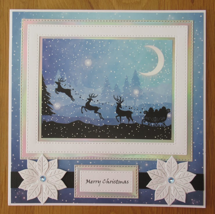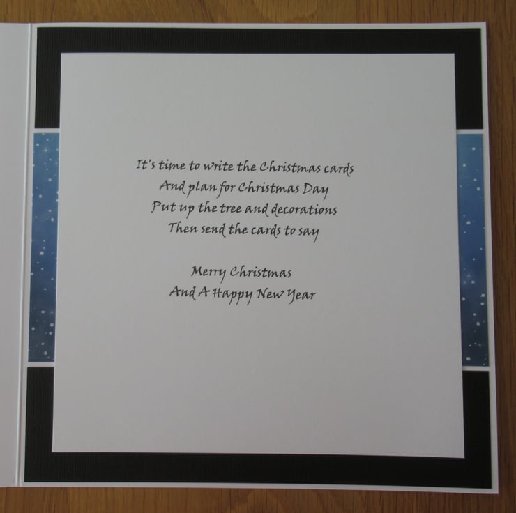 This lovely 8x8 inch Christmas silhouette card in blue and black has multiple layers including a white frame surrounding the image. It has a mat of silver mirror card and two home made poinsettias to embellish the card. The inside is finished to coordinate and has a christmas verse as pictured.